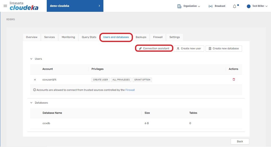 - On this Users and Databases tab, user can add the connection assistant, user, and database in the data store manually by fill in the form.