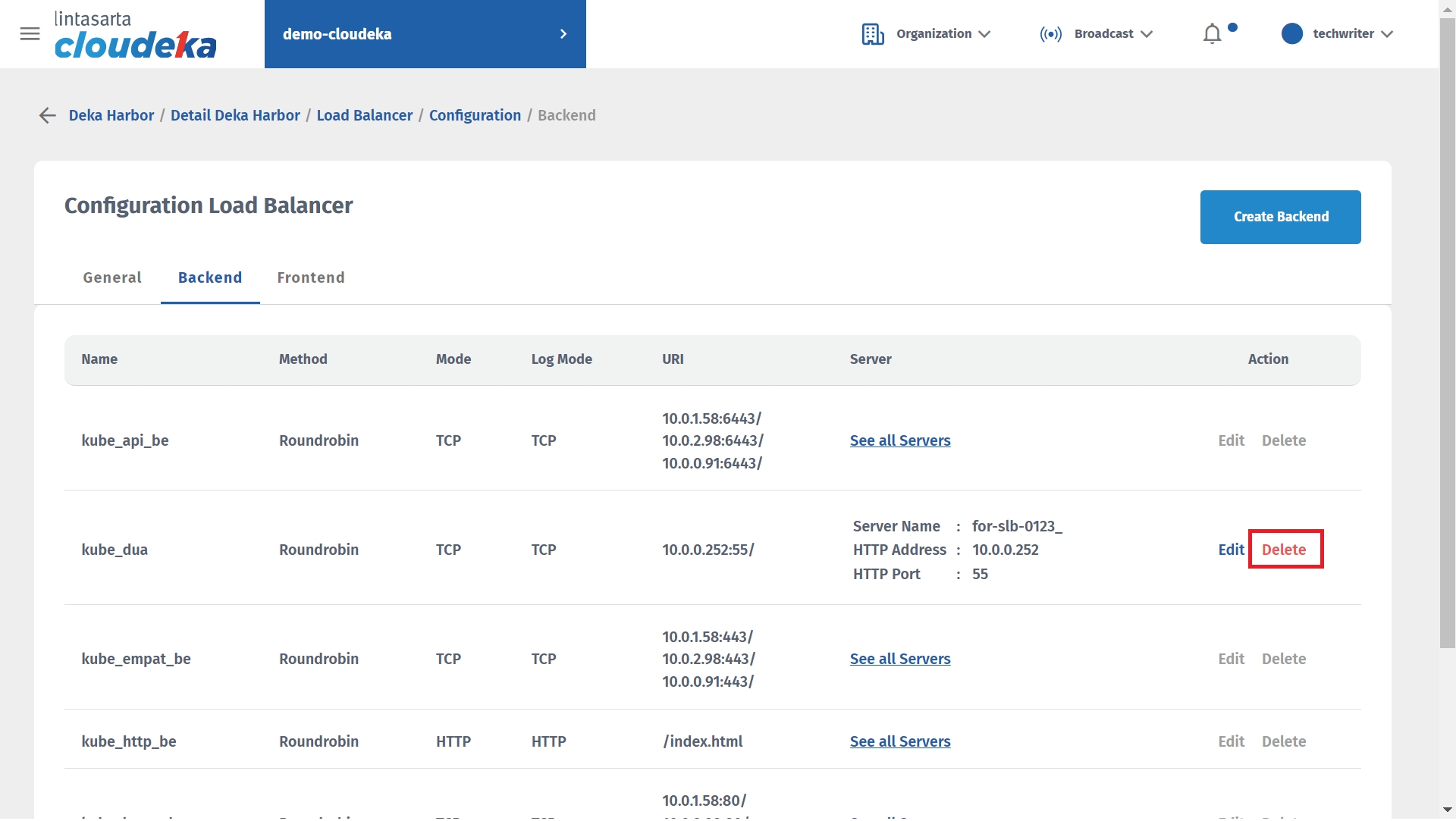 - The next step removes the Backend configuration. Select the Backend tab select the deleted Backend configuration by clicking the Delete button.