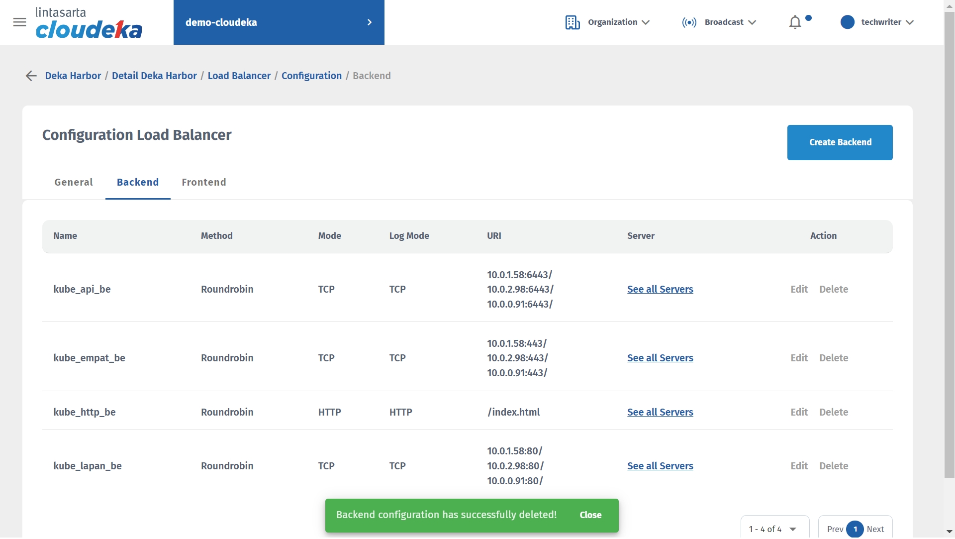 - The "Backend configuration has successfully deleted!" notification displays.