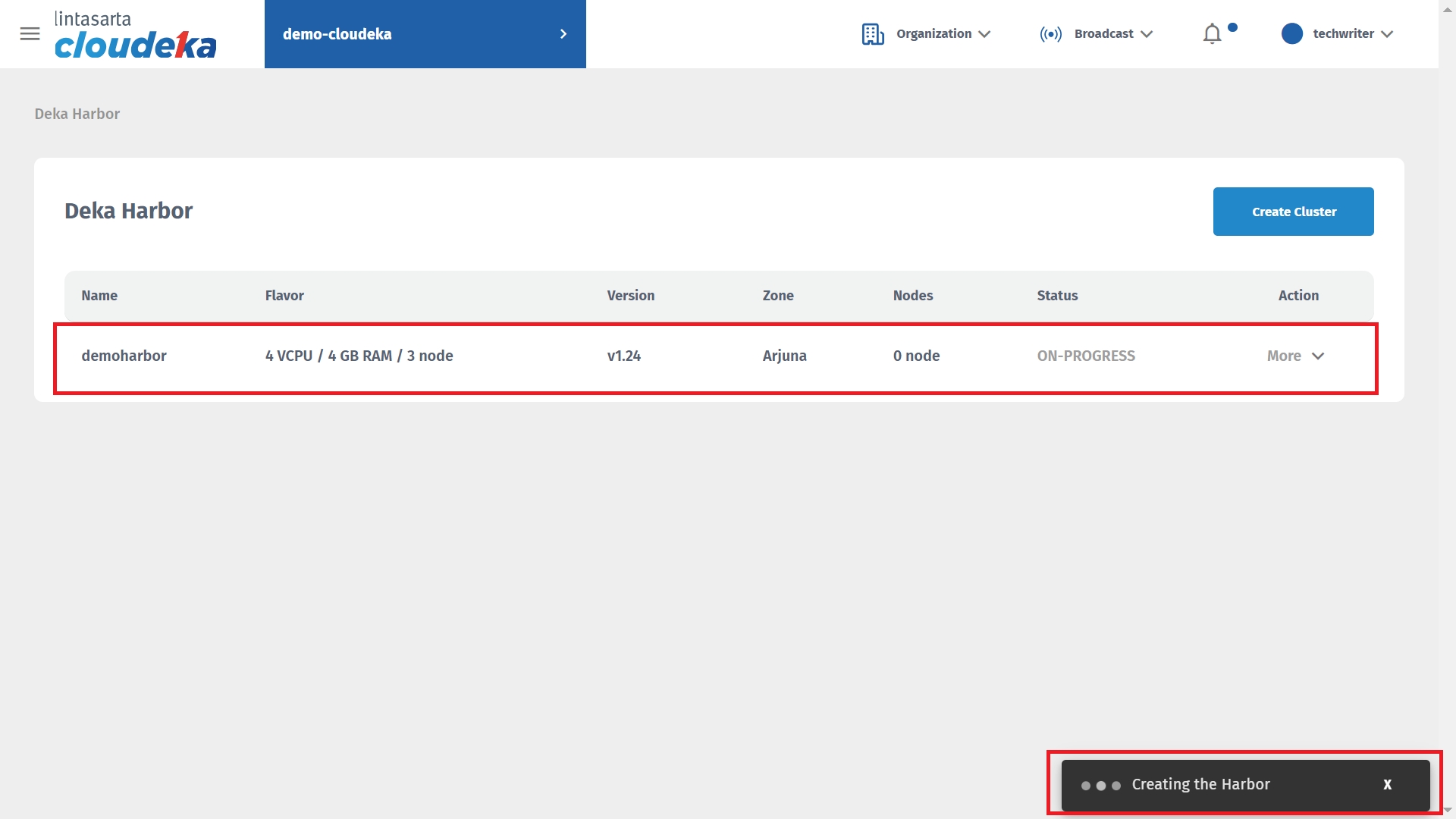 Describes the name of the Deka Harbor cluster created. Can only be written using lowercase letters and numbers.