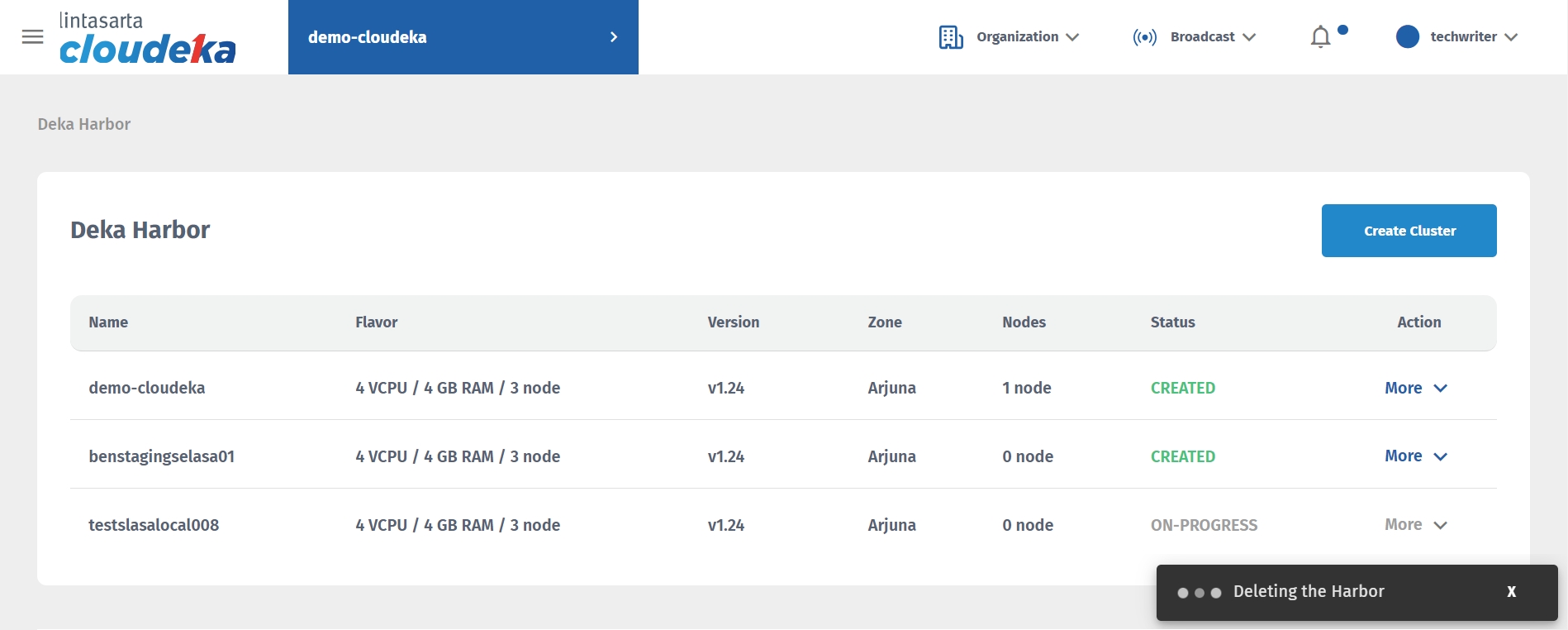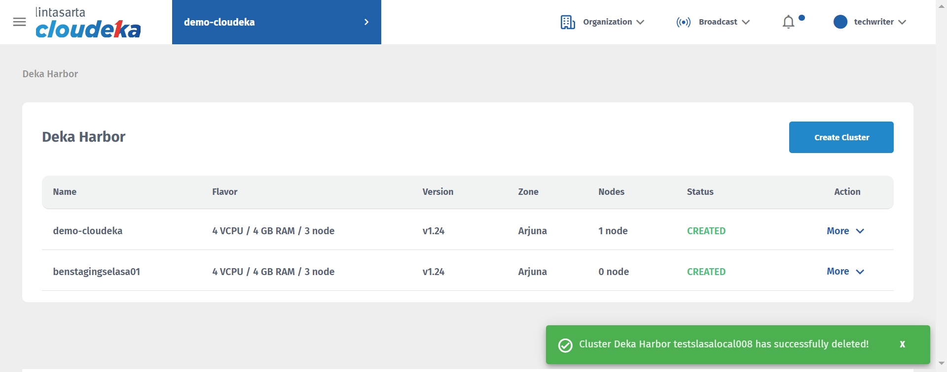 Wait until the removal process completes until the "Cluster Deka Harbor [cluster name] has been successfully deleted!" notice displays.