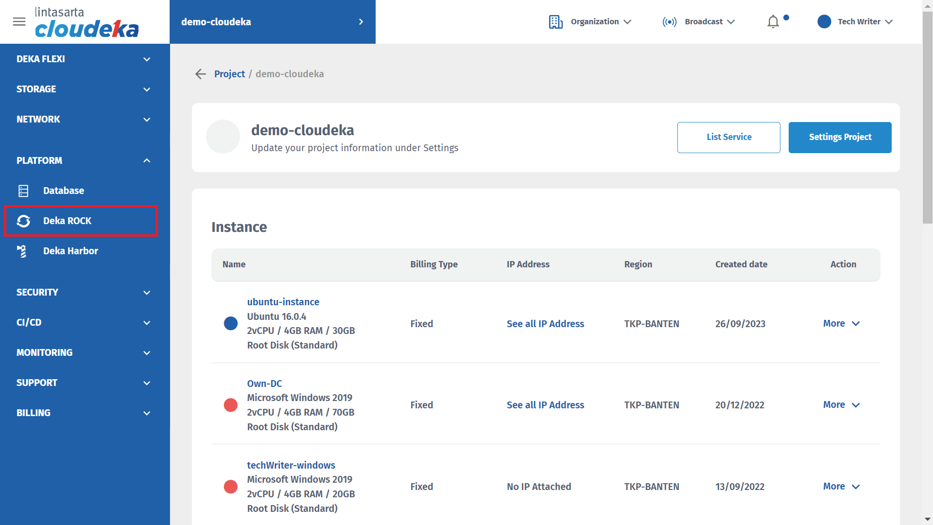 * On the Cloudeka services page select Platform and click the Deka ROCK menu.