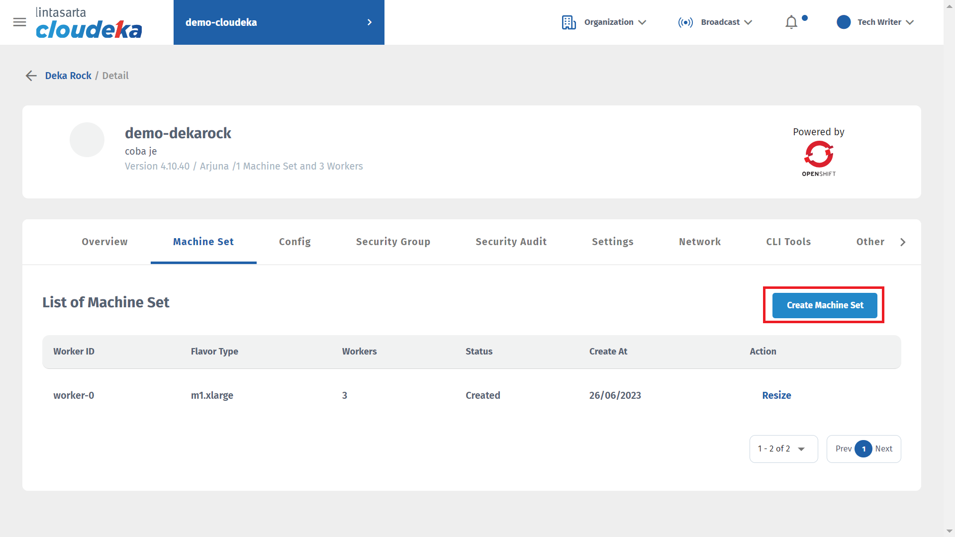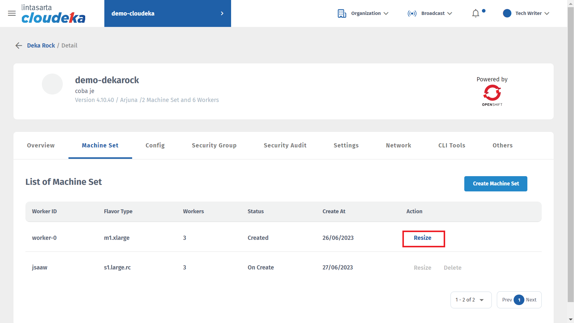 Machine Set you can add a new set of machines, add workers, and remove the added set of machines. You cannot delete a set of machines that were already available at the beginning of Deka ROCK creation.