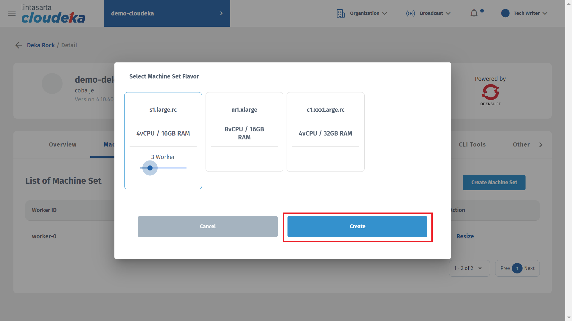 * Select the Flavor options as needed and the worker to use and click the Create button to continue creating the machine set.