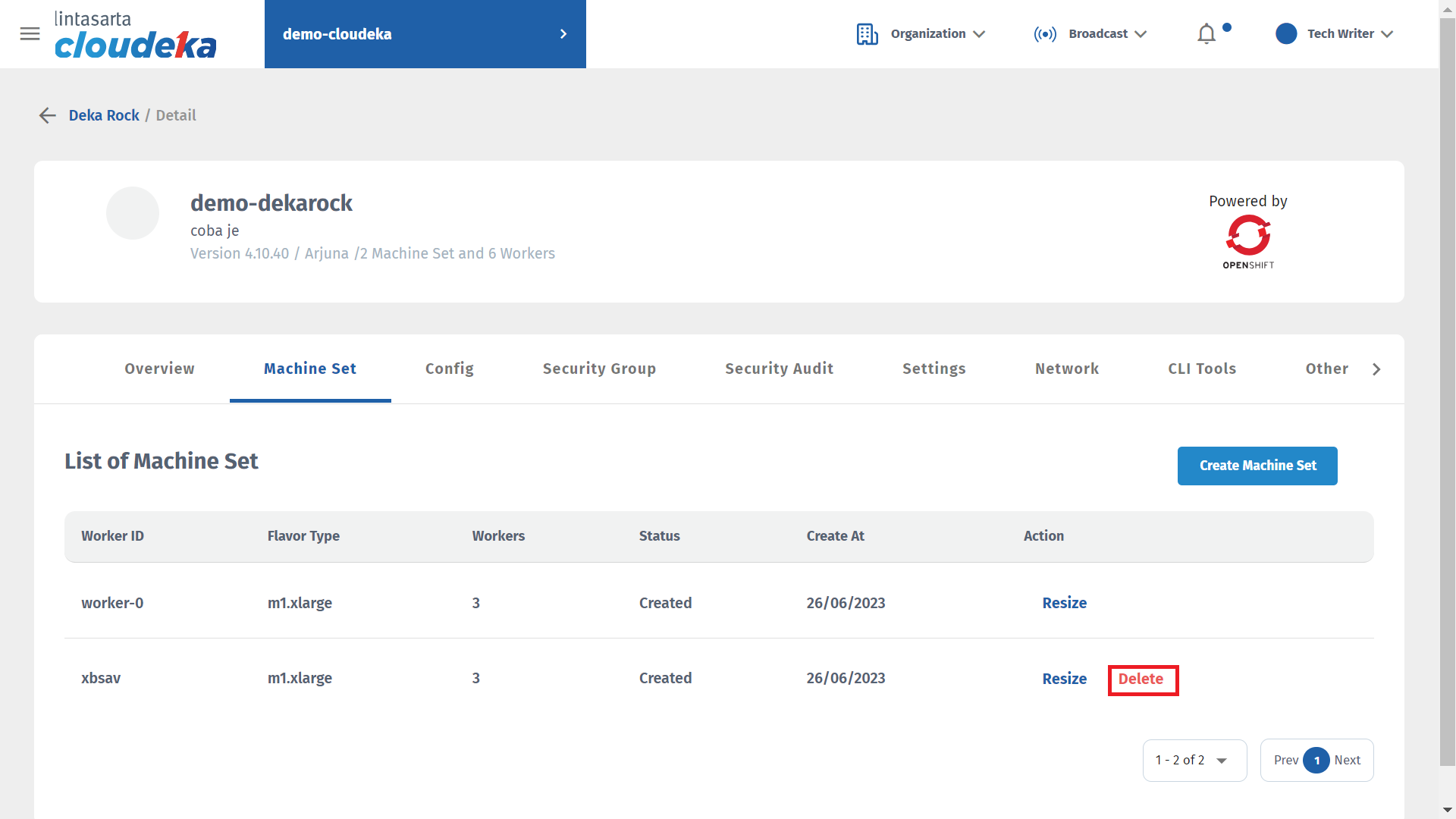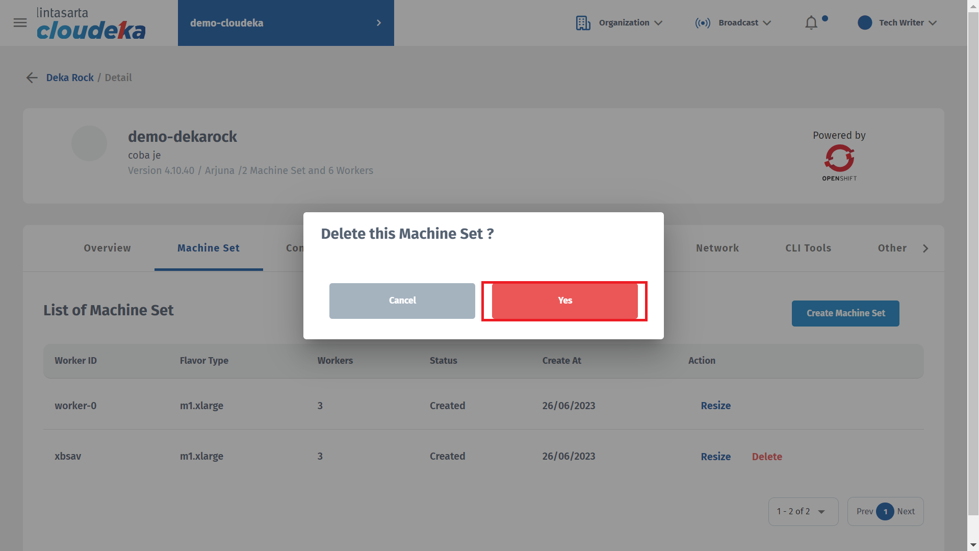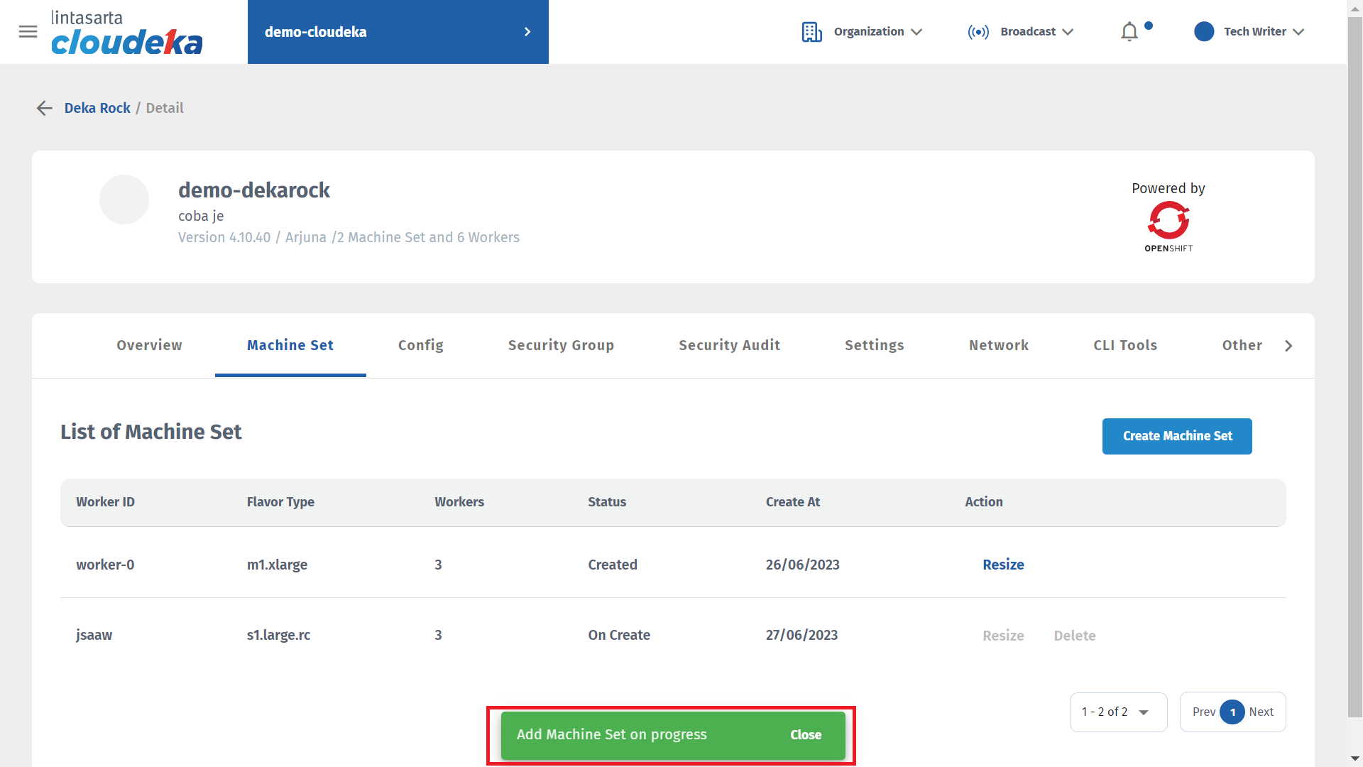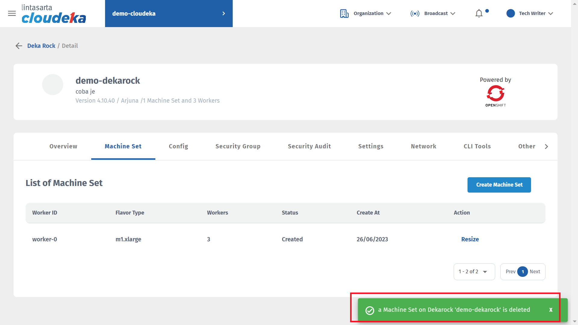 * Wait until the deletion process is complete and a notification appears “a Machine Set on Dekarock \[project name Deka ROCK] is deleted.
