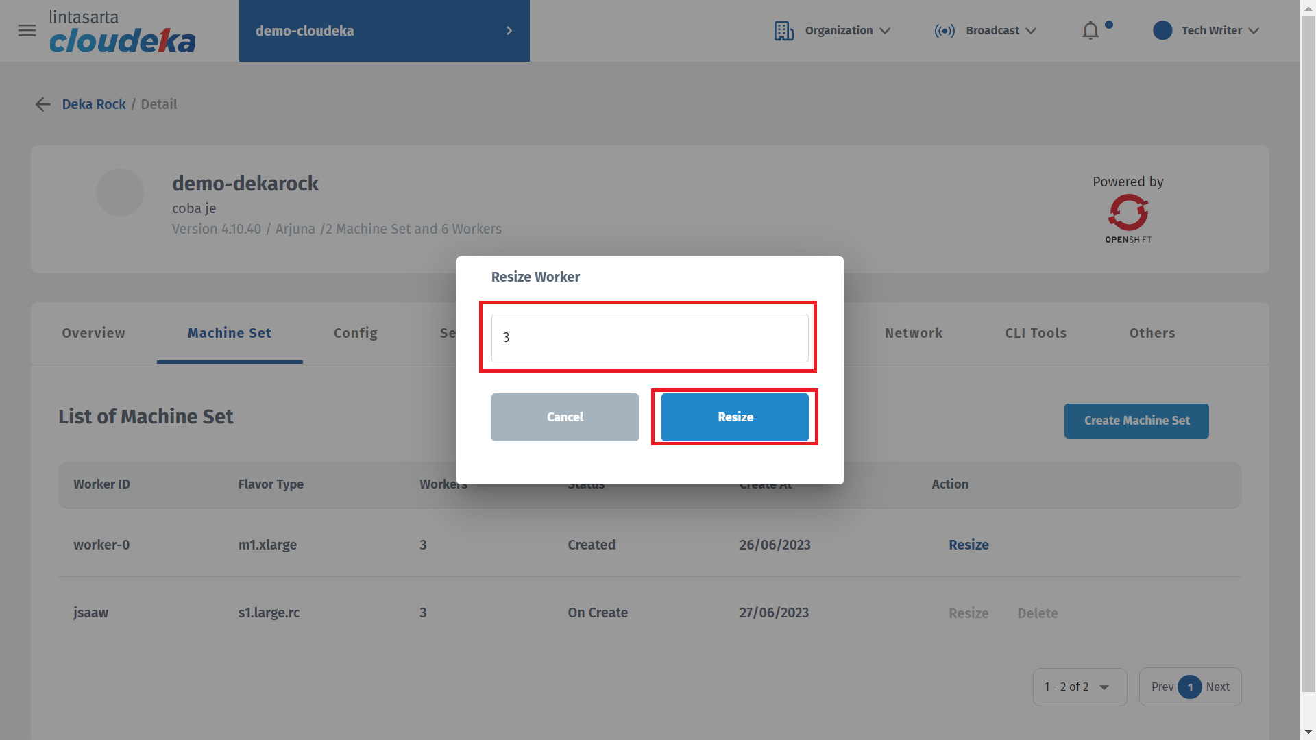 * Enter the worker size and click Resize to continue the process.