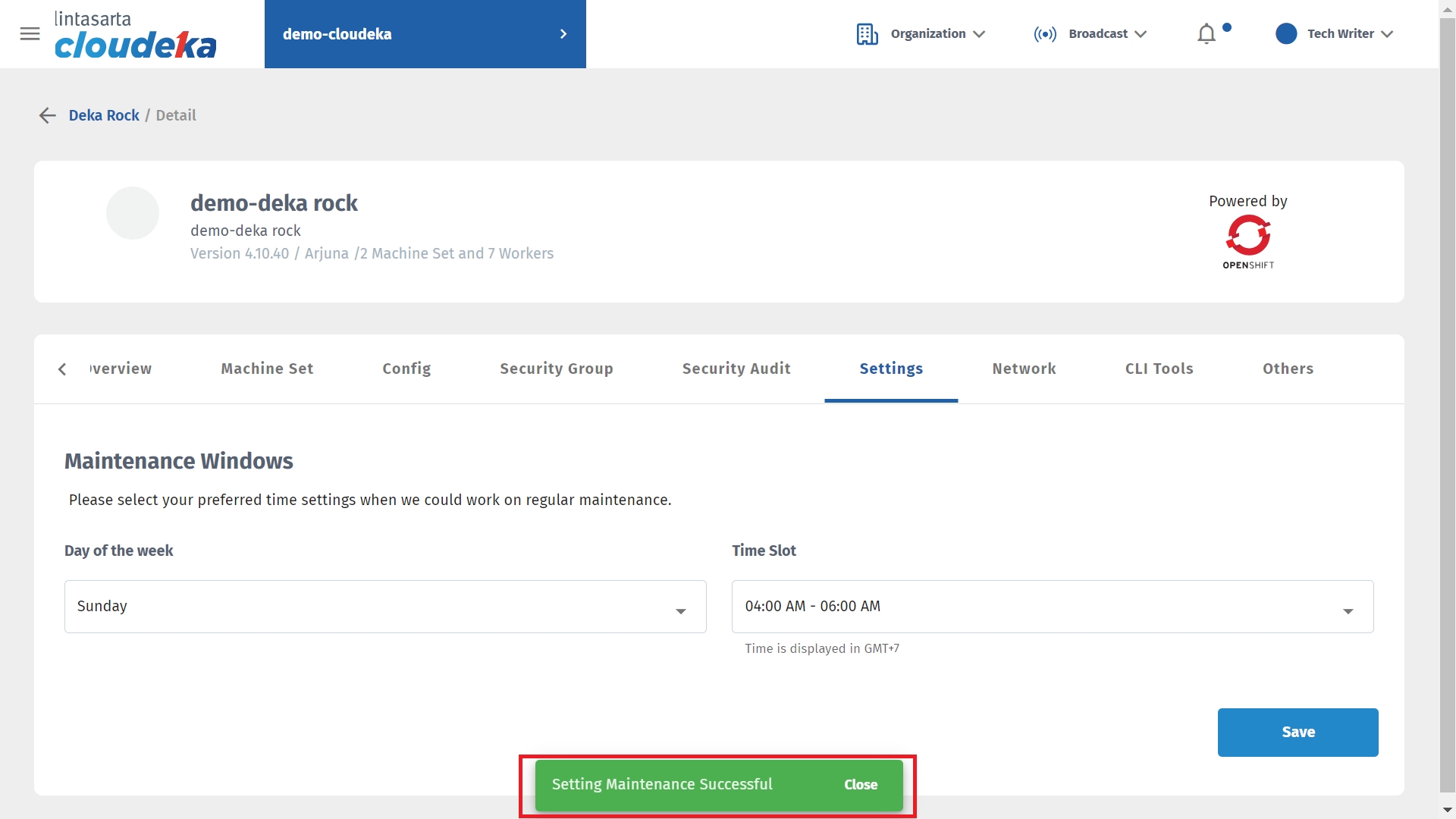 - Setting Maintenance Successful notification displays that successfully saved maintenance schedule changes.