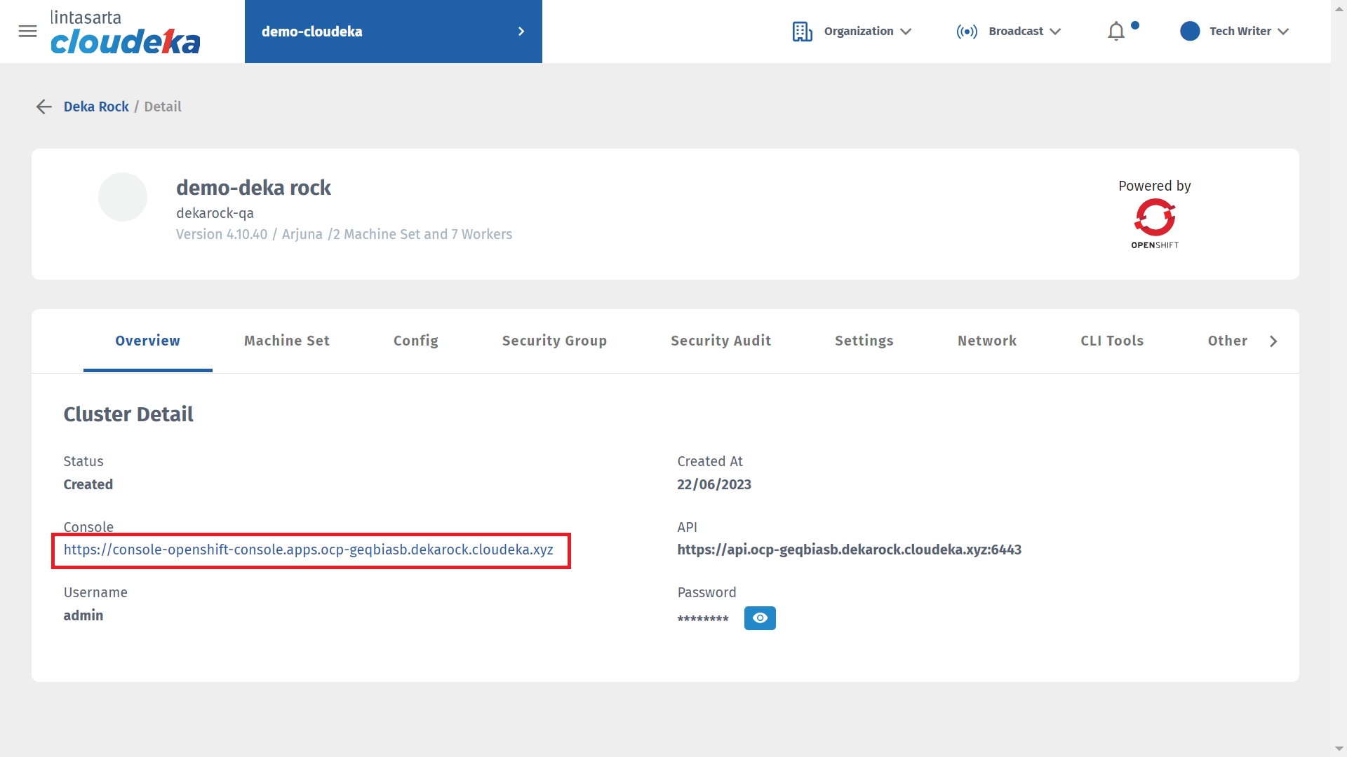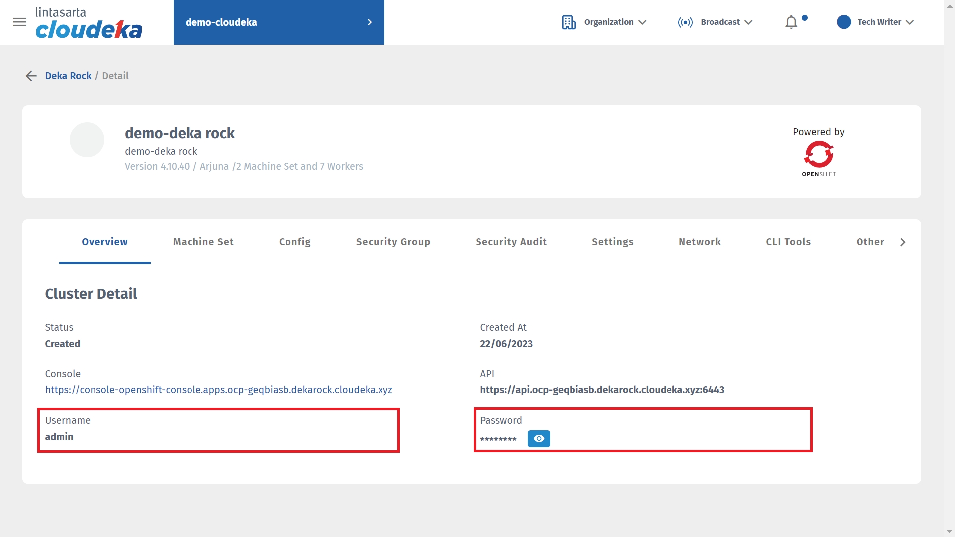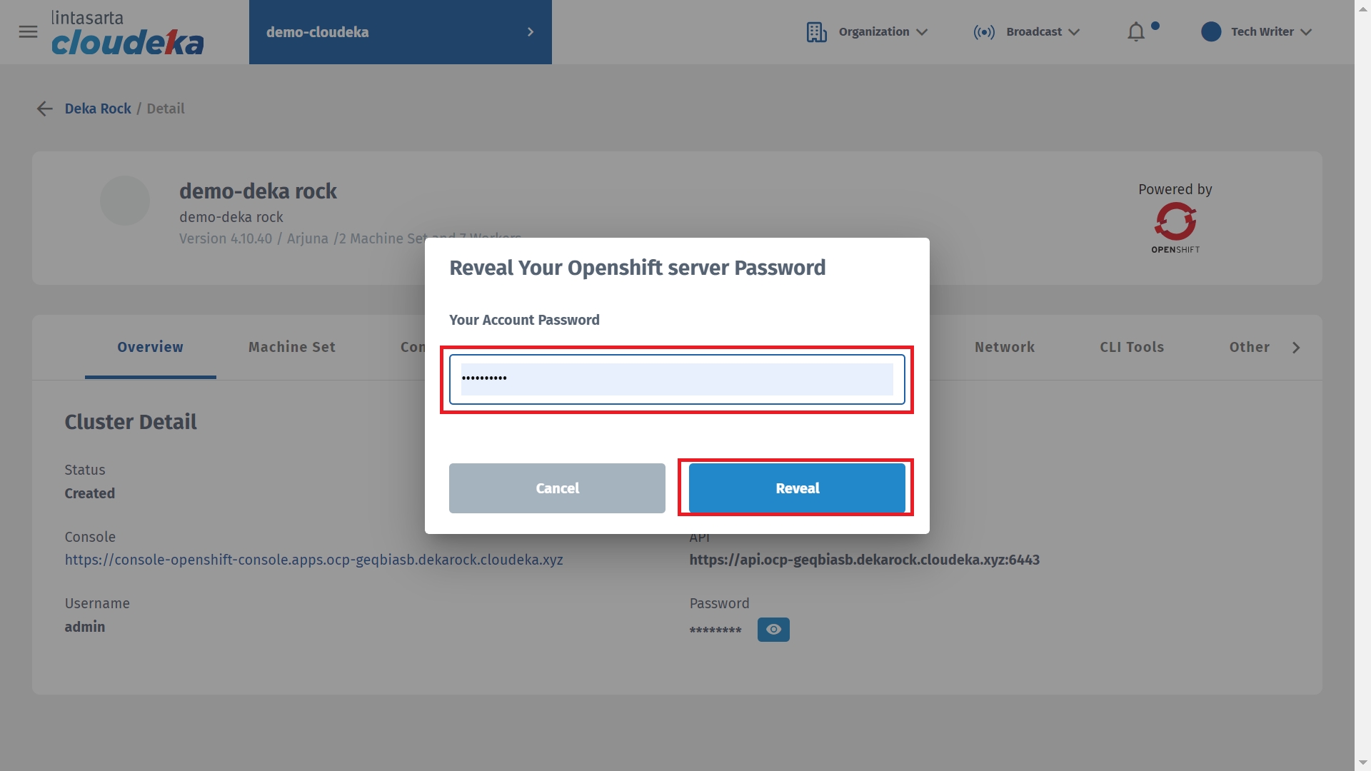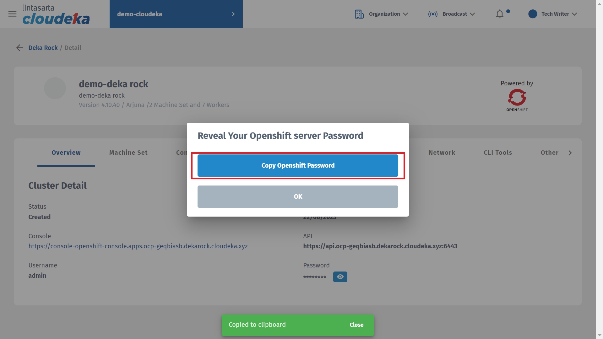 - Copy the username and password on the Overview tab. For Password, click on the eyeball, enter the password used when logging in to the Cloudeka portal service, and click the Copy Openshift Password button to copy the password used to enter the Openshift service.