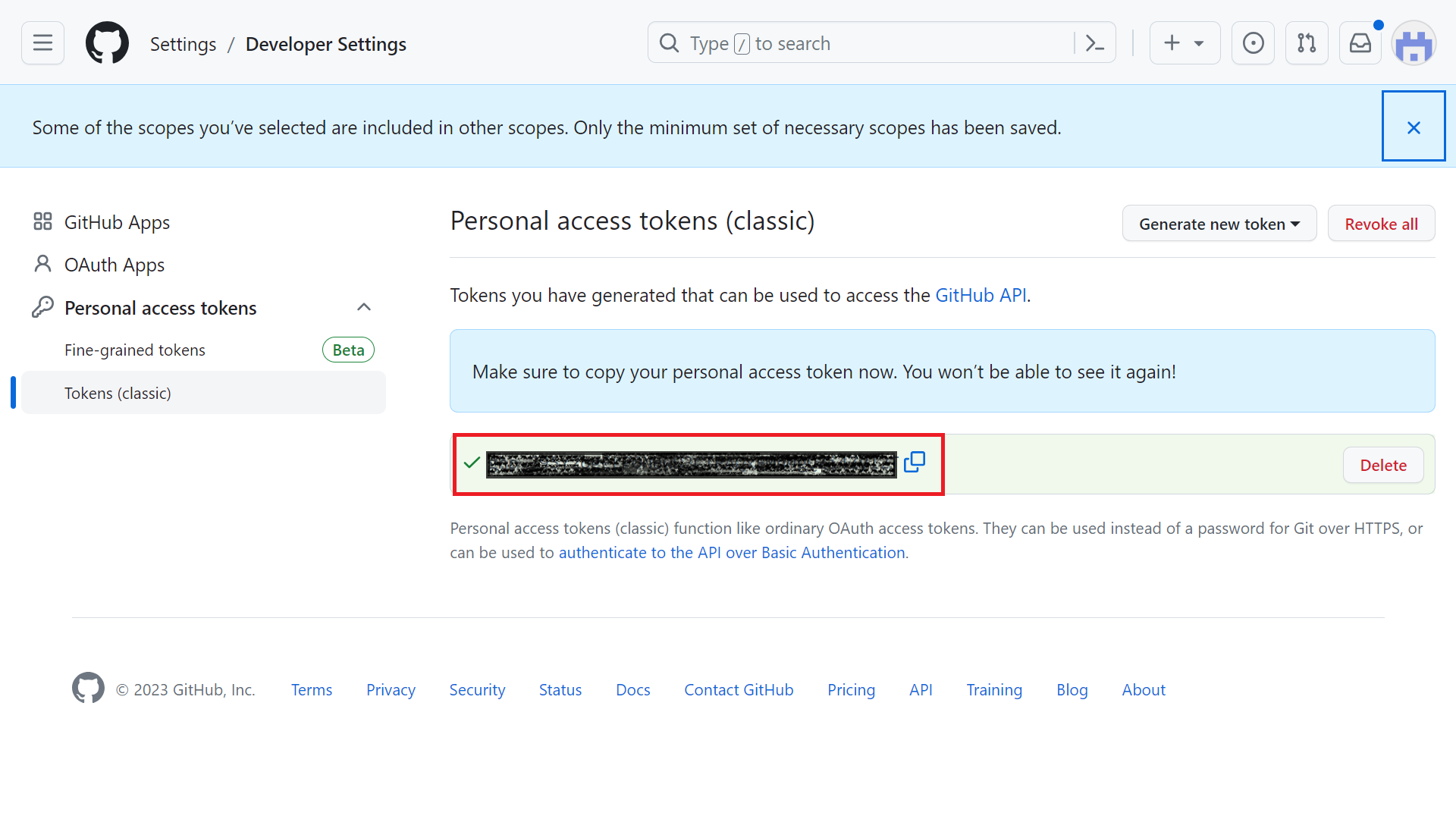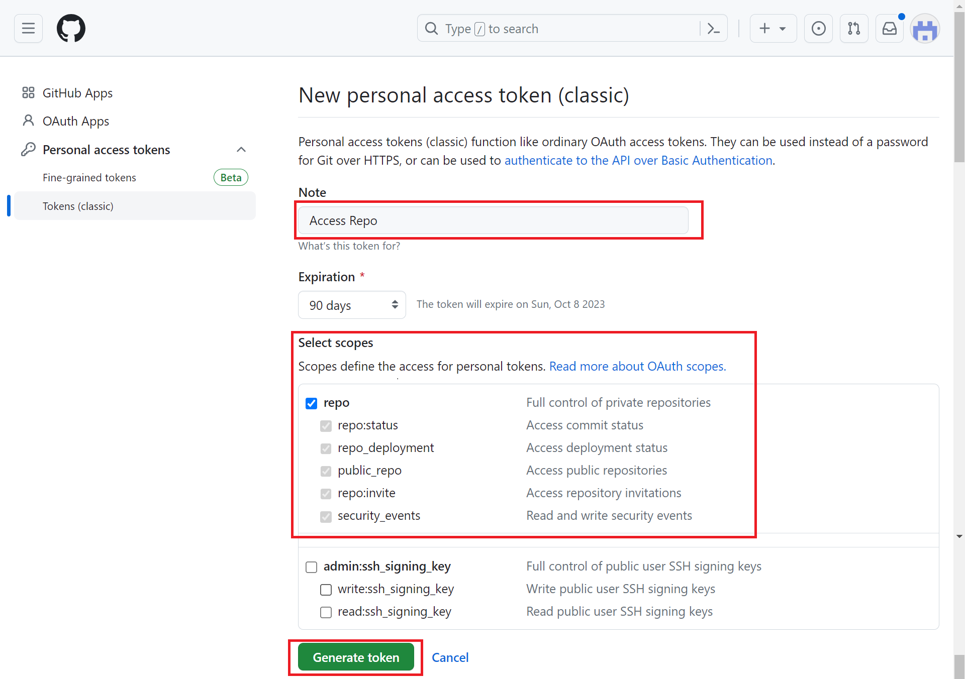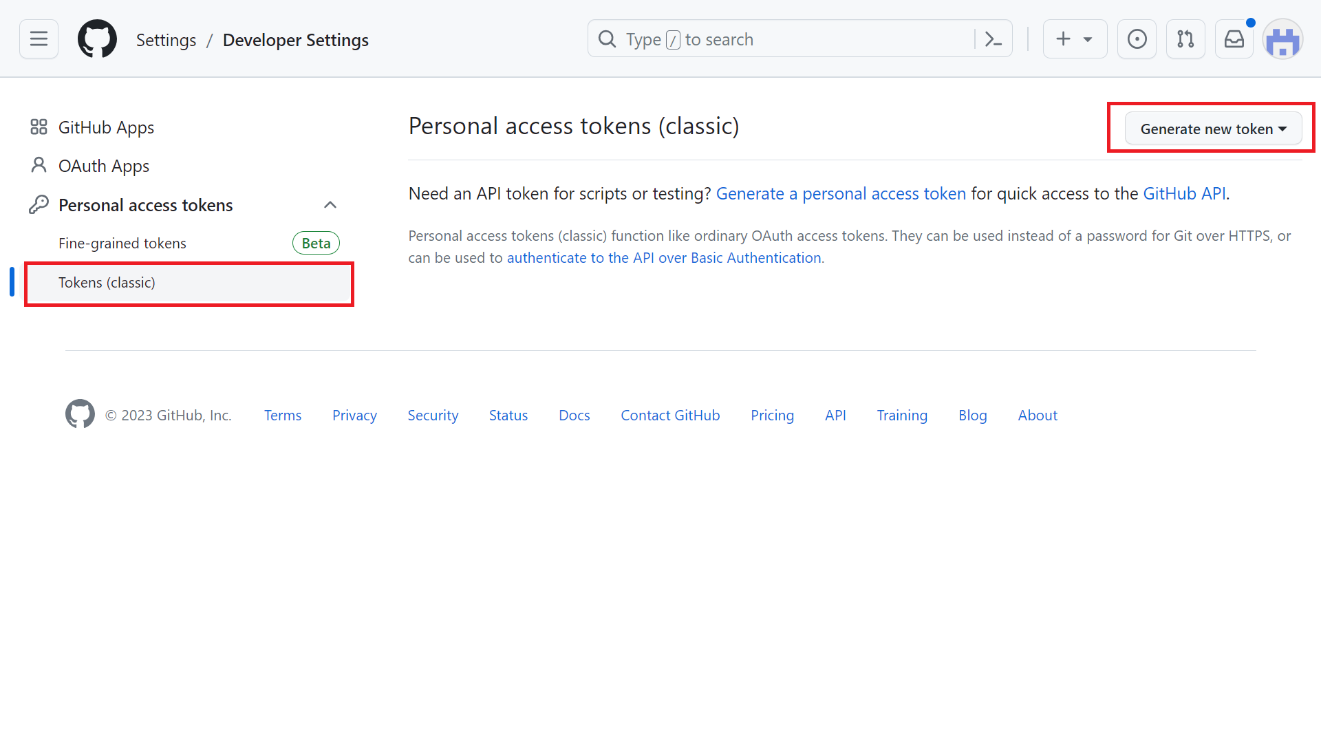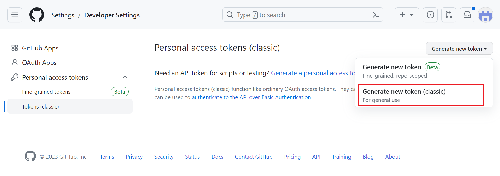 Select Developer Settings and select Token (classical) click the Generate new token button. Click Generate new token (classical).