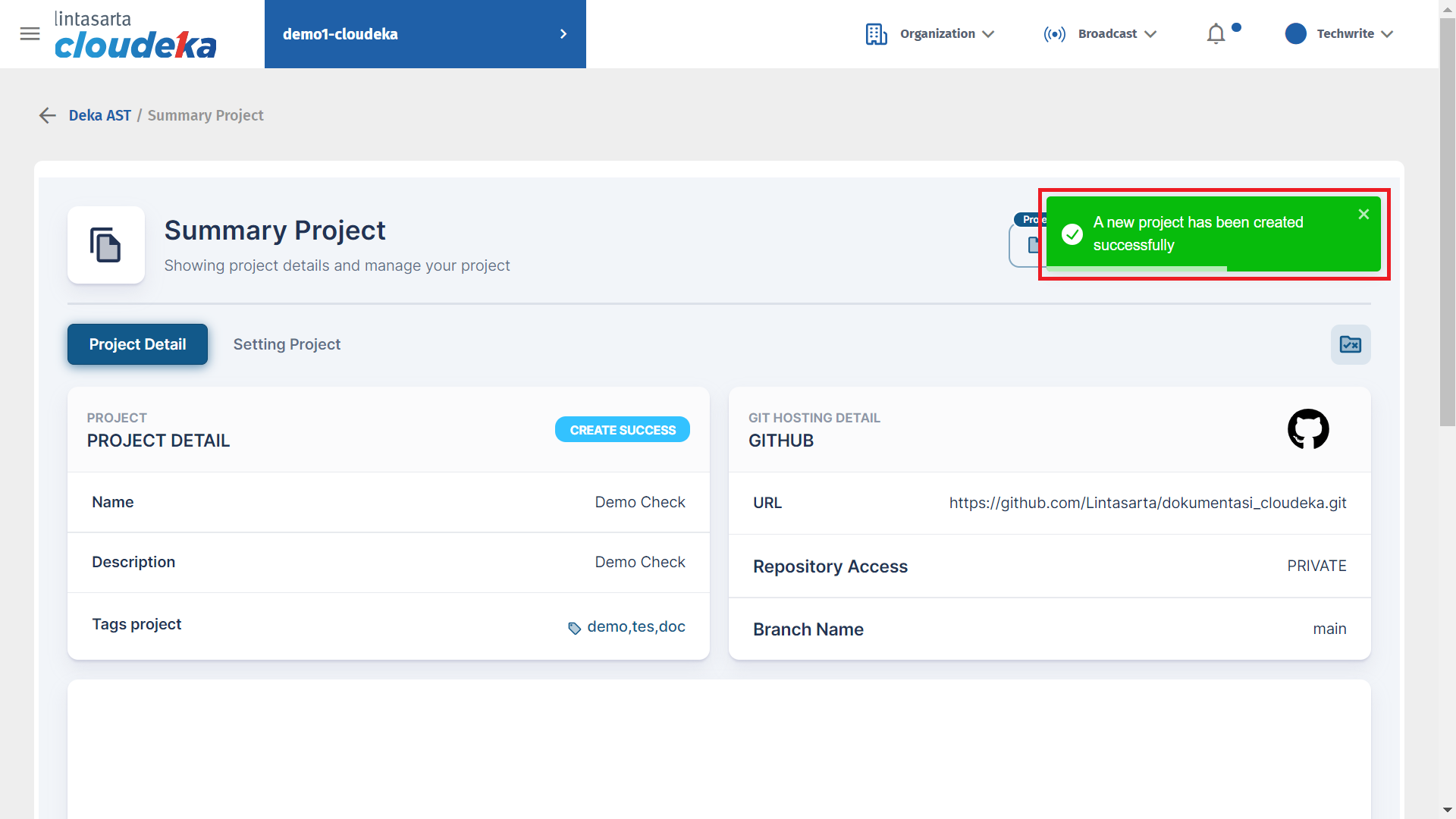 Wait until the project creation process is complete and the "A new project has been created successfully" notification displays.