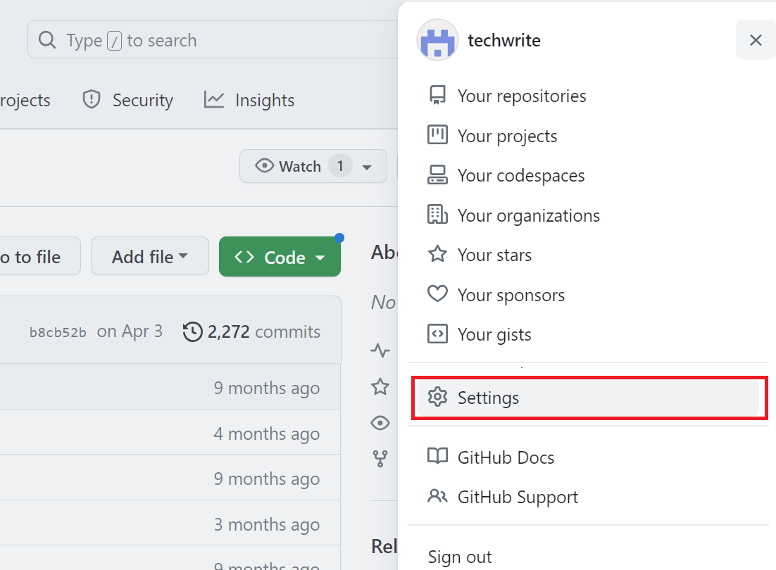 Log in to your github account, select Settings.