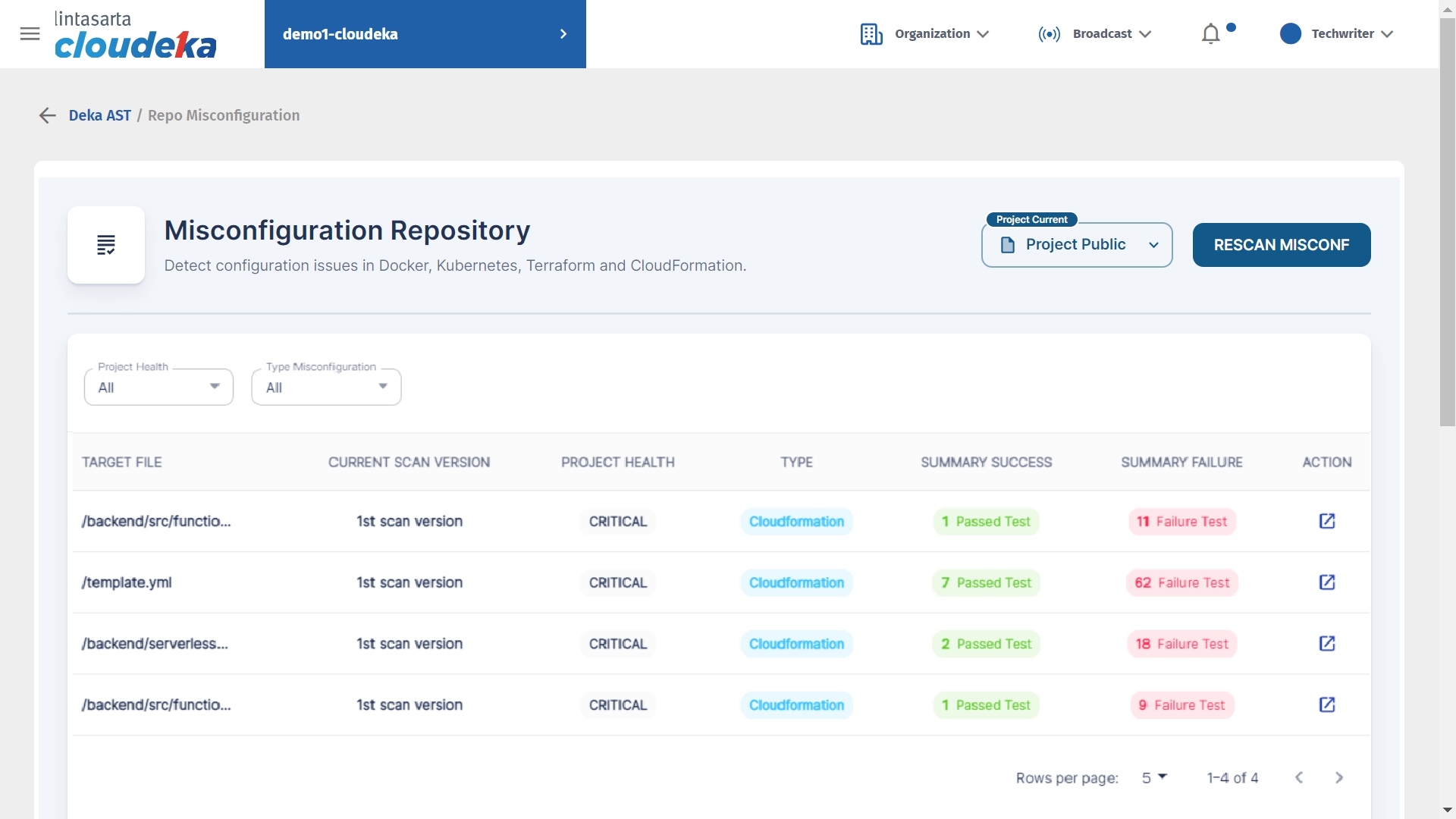 The Repo Misconfiguration menu displays information containing incorrect configurations, insecure settings, and settings that do not comply with security standards. On the Repo menu Misconfiguration detects configuration problems in Docker, Kebernetes, Terraform and CloudFormation.