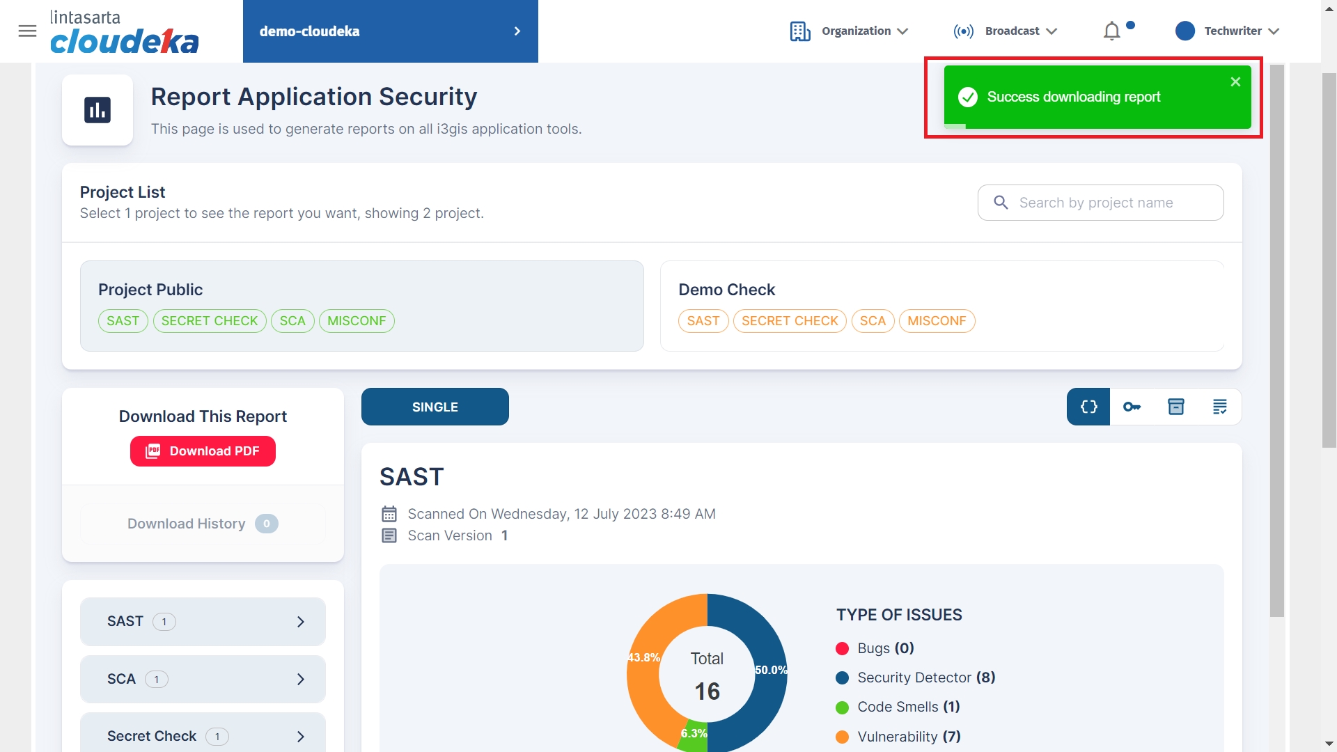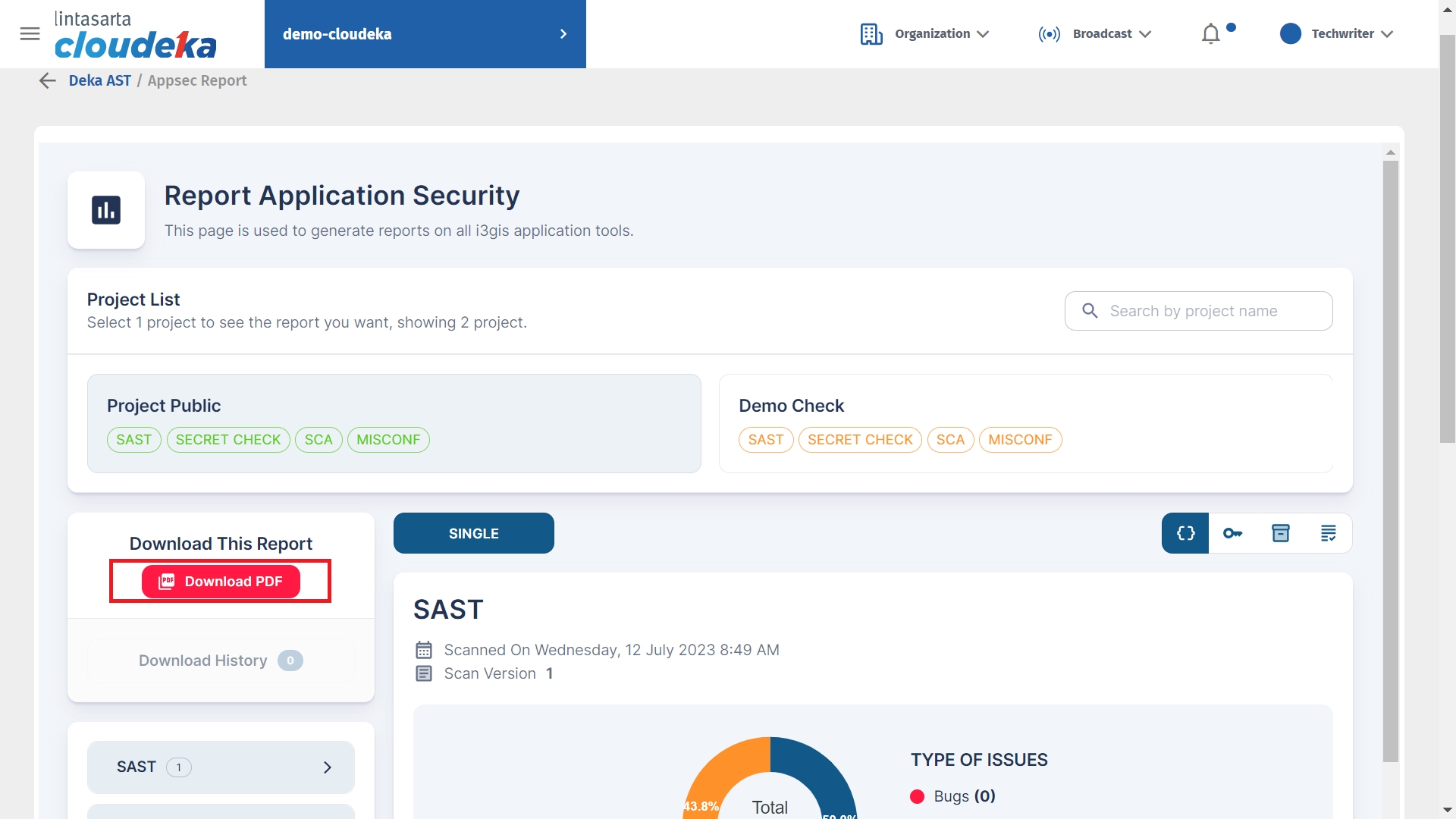 - Select the project from which to download the application security report, and press the PDF Download button Download PDF.