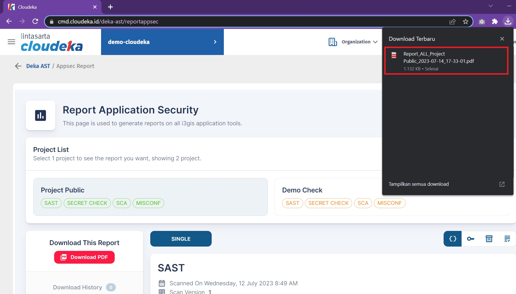 - On the Cloudeka services page, select Appsec Report on the Security menu in Deka AST.