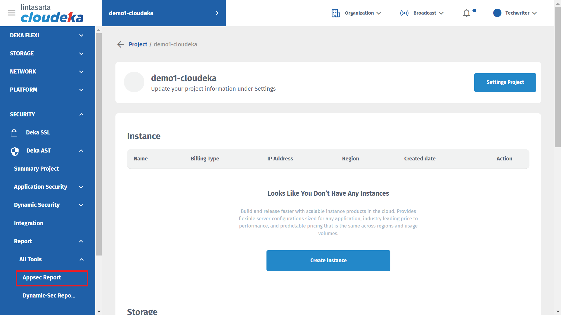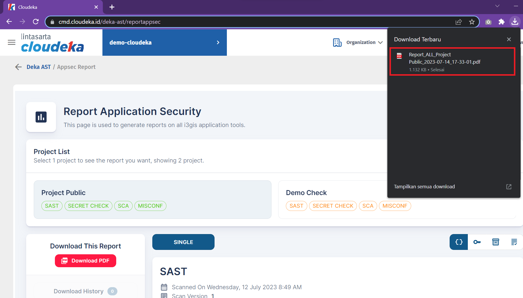 * On the Cloudeka services page, select Appsec Report on the Security menu in Deka AST.