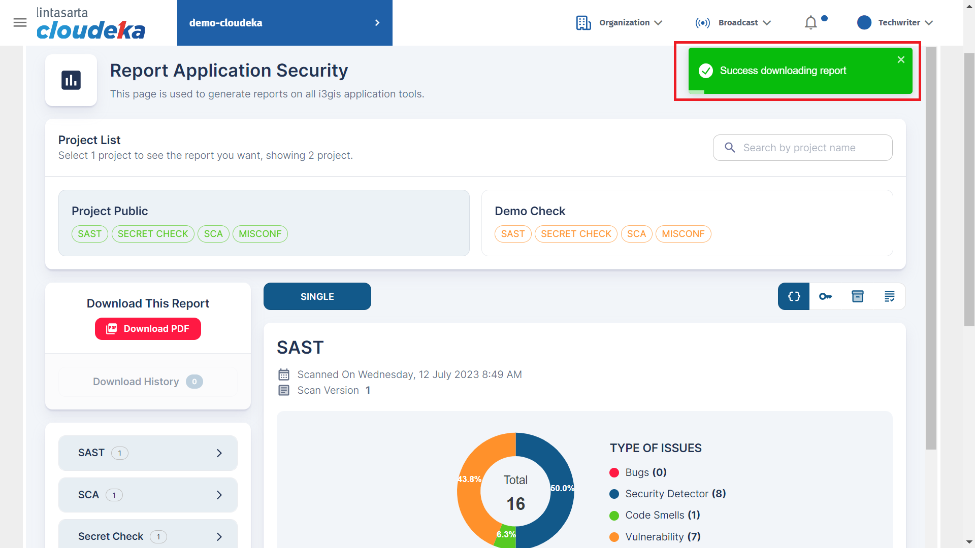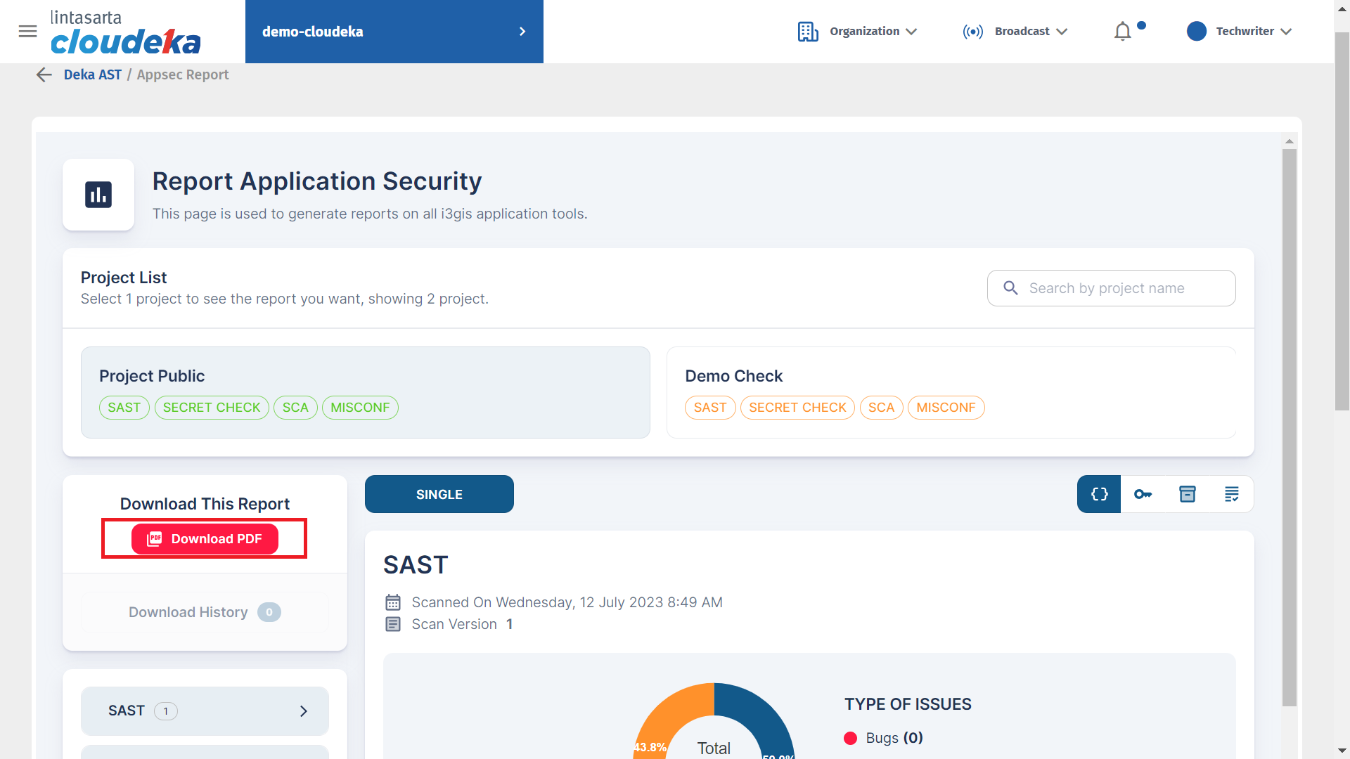 * Select the project from which to download the application security report, and press the PDF Download button Download PDF.