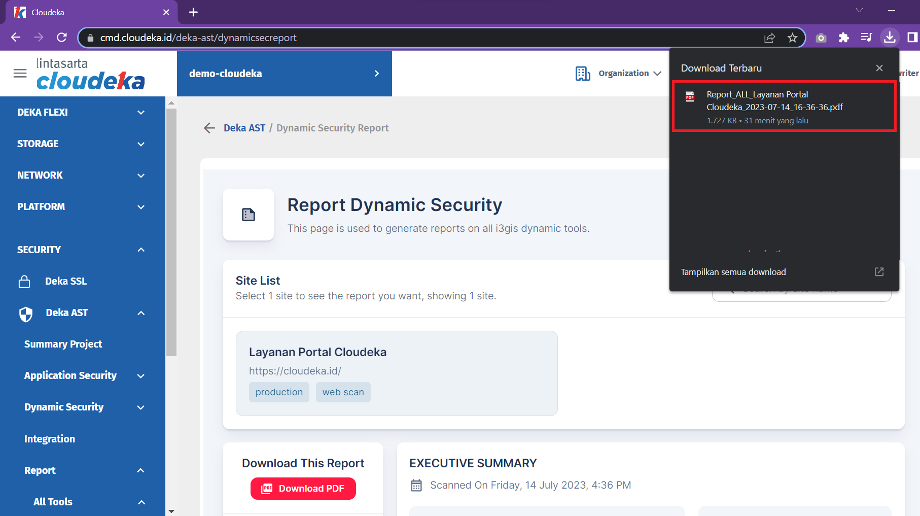 * On the Cloudeka services page, select Dynamic Sec Report on the Security menu in Deka AST.