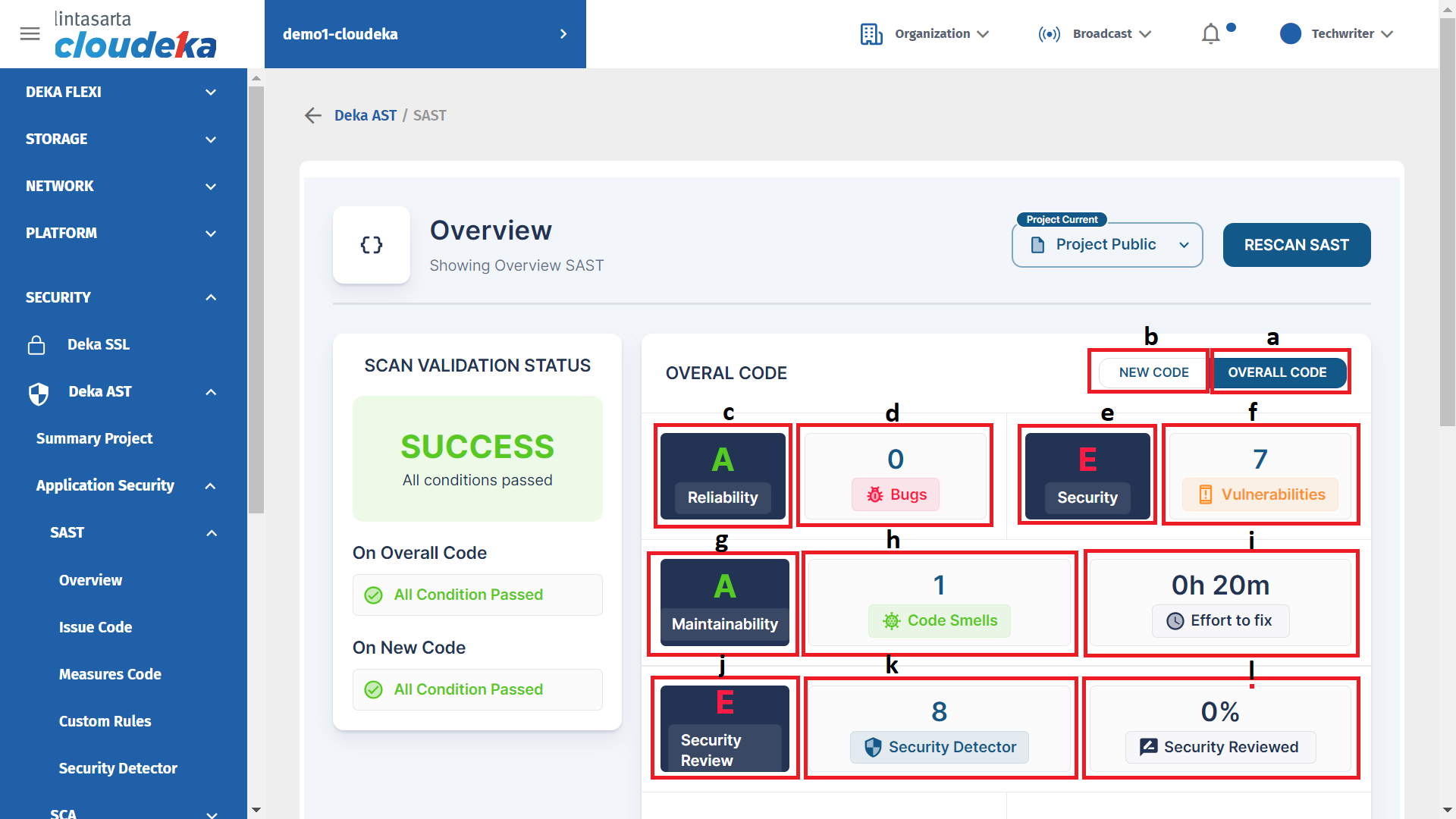 To review the results of a scanned project. On the Cloudeka services portal page click the Overview menu. On the Overview page of SAST there is a summary of the information.