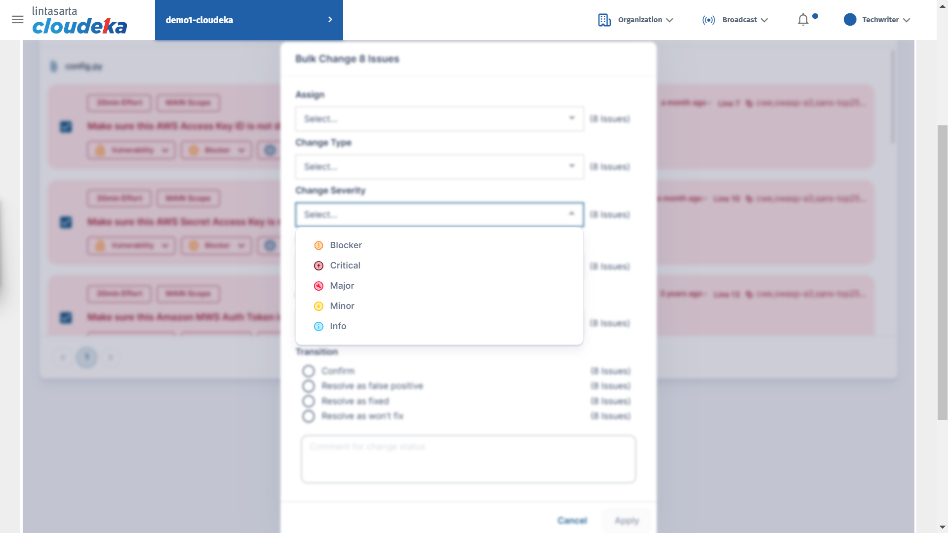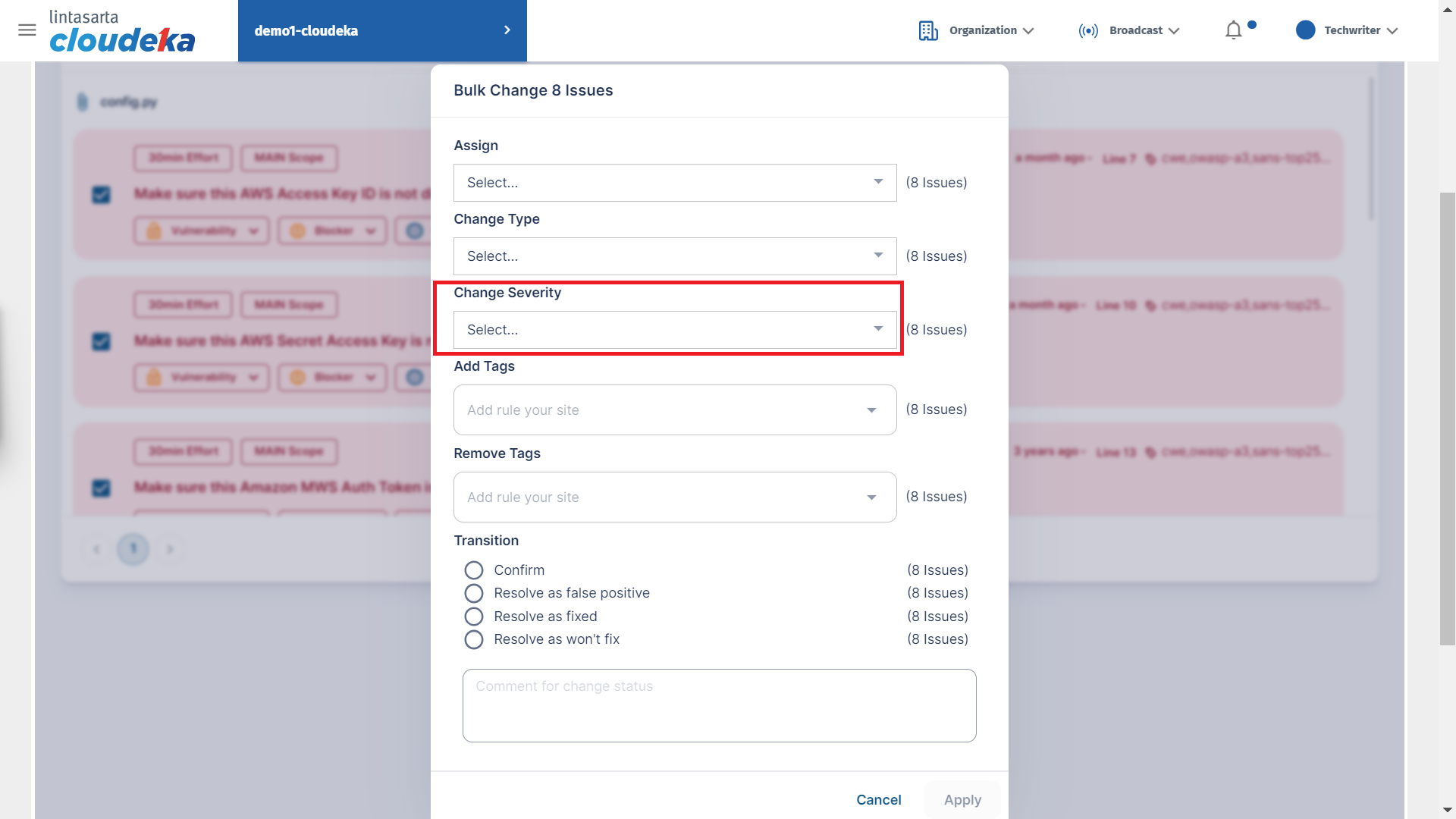 * Display the Bulk Change form, in the Change Severity column, select the condition to change simultaneously and click the Apply button to save the changes.