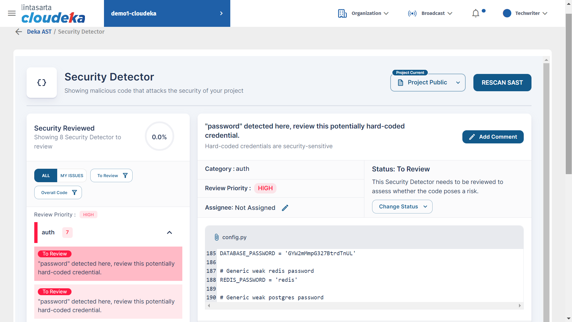 The Security Detector page displays malicious code that can attack the security of your project.