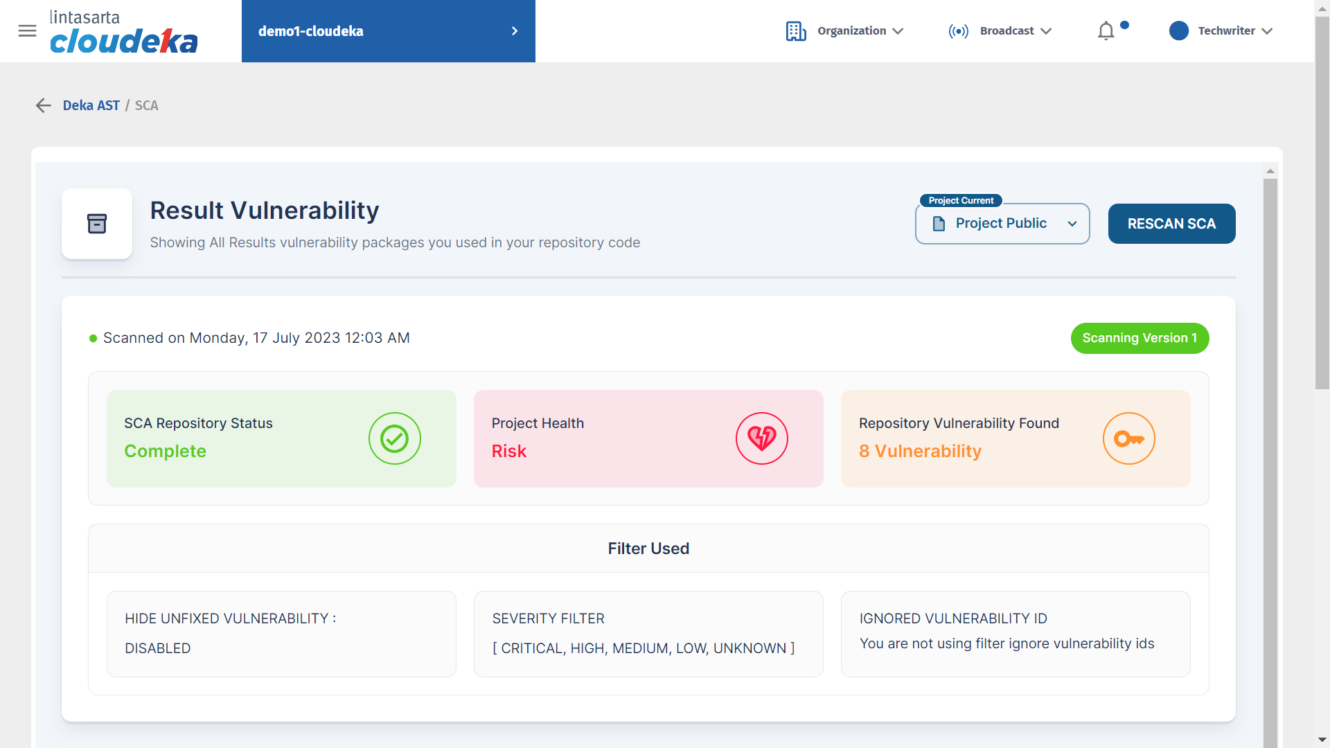 To ensure the security of your repository code, it is important to display all vulnerabilities present in your project. You can identify software components that have known vulnerabilities and take appropriate action to implement the required mitigation steps. Through this menu, you can increase security and ensure that the repository code is protected from attacks that can exploit existing vulnerabilities. In Result Vulnerability displays three dashboards: SCA Repository Status is the scan status of the repository code, Project Health is the health quality of the repository code, and Repository Vulnerability Found is the number of vulnerabilities found in the repository code.