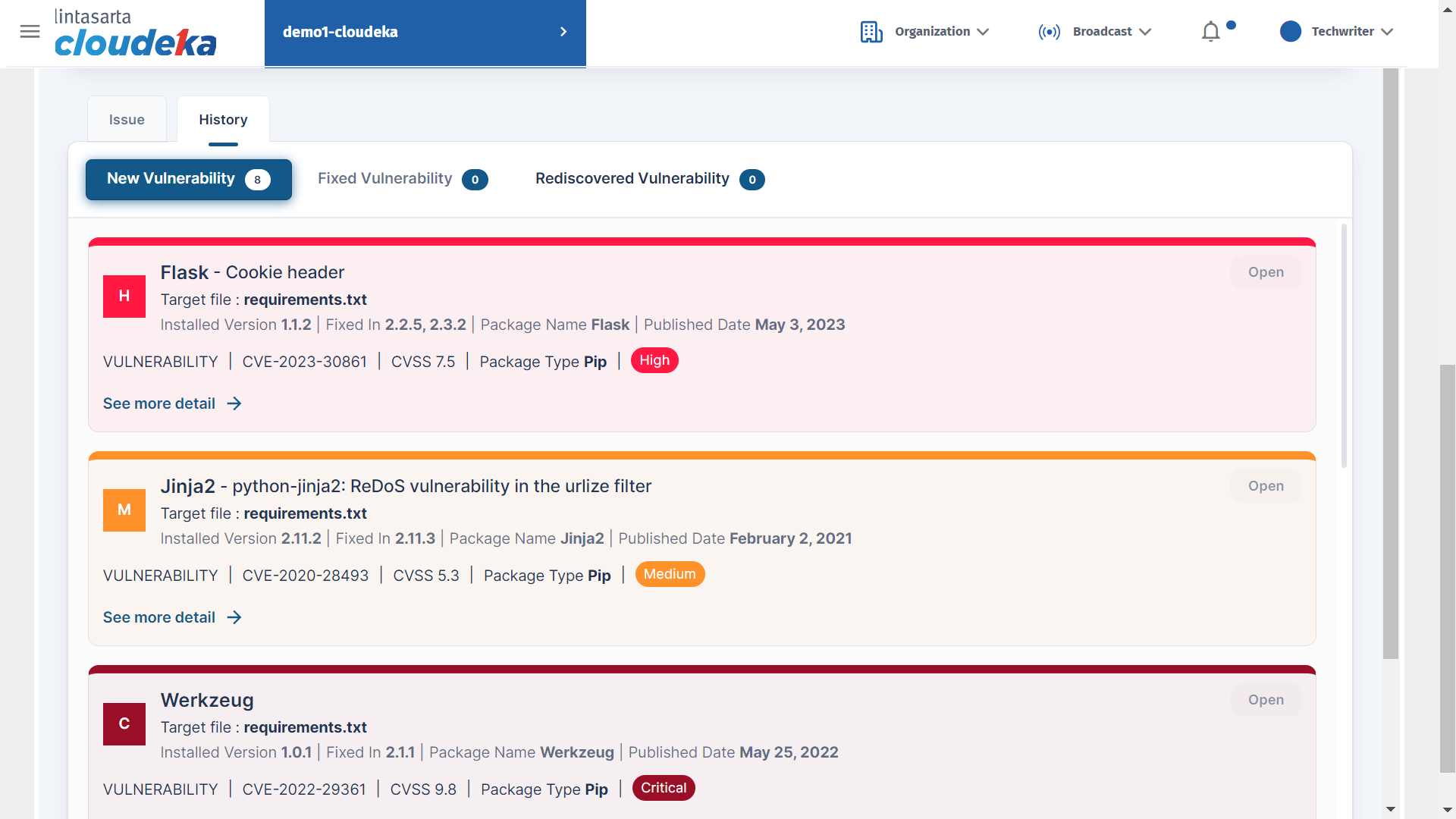 On the History tab of the Result Vulnerability is a history of changes associated with vulnerabilities that are identified in your repository code. The history tab is classified as three of which New Vulnerability is a new vulnerability found when successfully scanned, Fixed Vulnerability is a fixed vulnerability, and Rediscovered Vulnerability is a vulnerability recovered when the scan is repeated. To view details of the new vulnerabilities found during the scan click See more Details to view the severity and explain why this could be a problem.