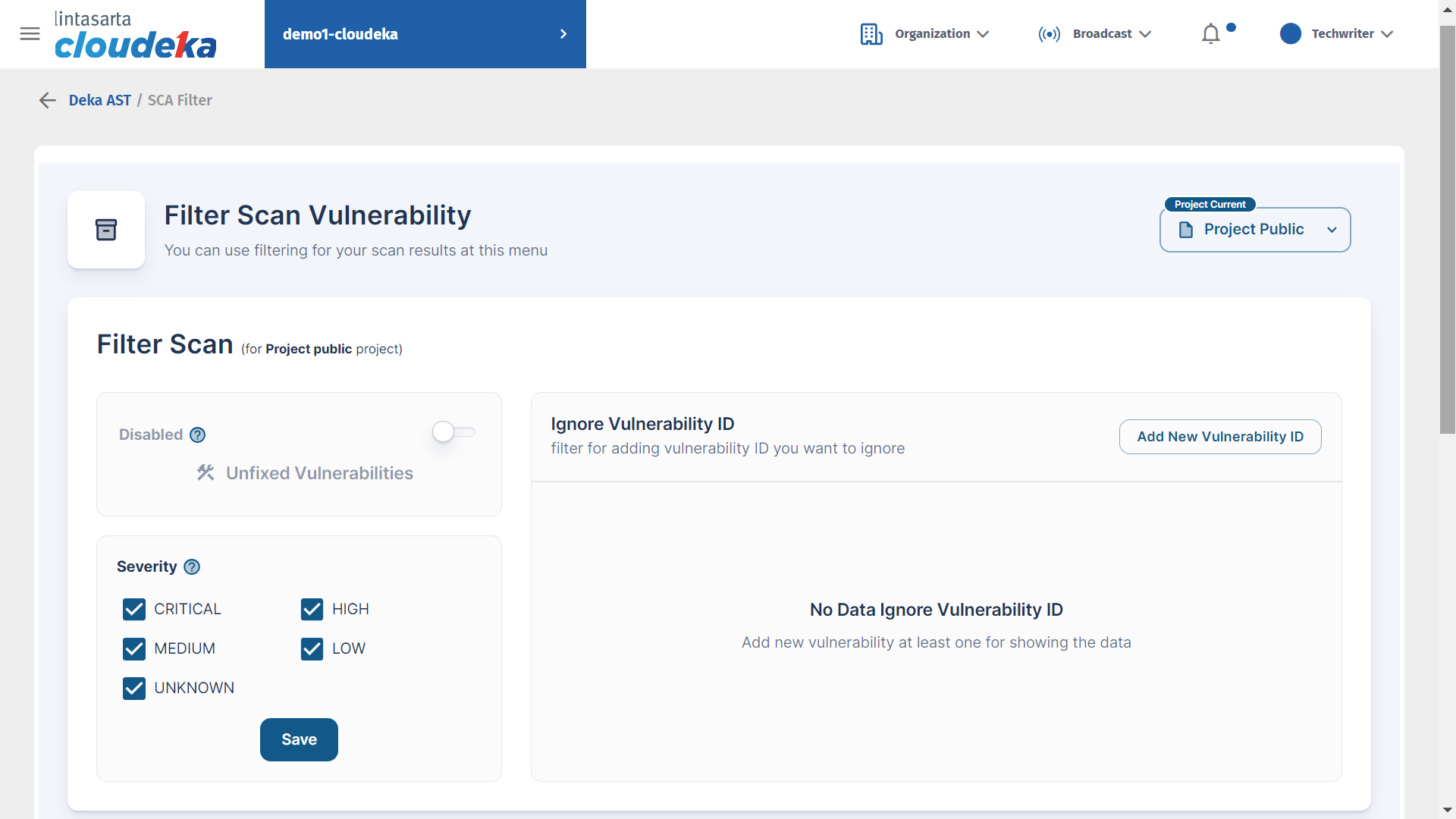 On the Scan Vulnerability Filter menu, there are three dashboards: Unfixed Vulnerabilities to detect uncorrected vulnerabilities, user Severity can select a severity level to display on the Result Vulnerability page, and the user ID Ignore Vulnerability ID can ignore the vulnerability by adding a new vulnerability ID.