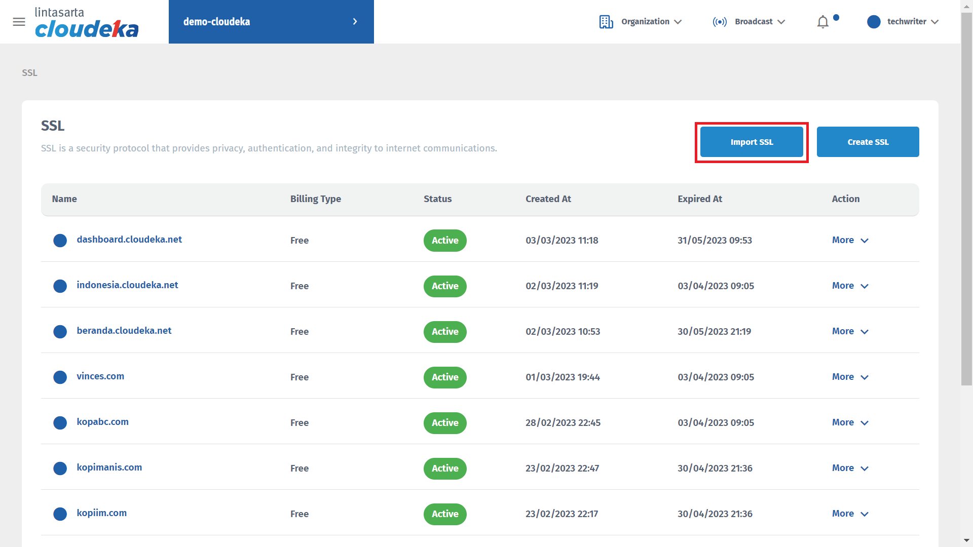 * After filling in all forms, click the Import SSL button.