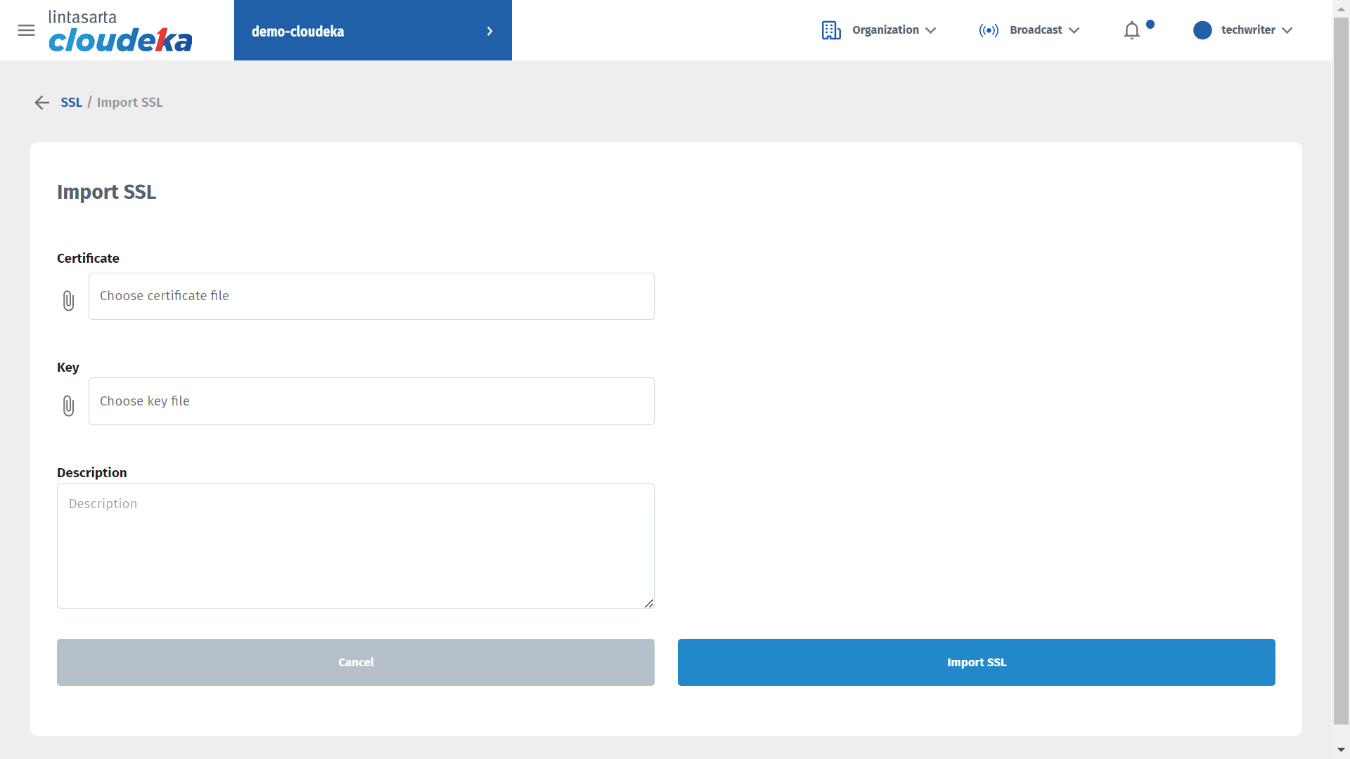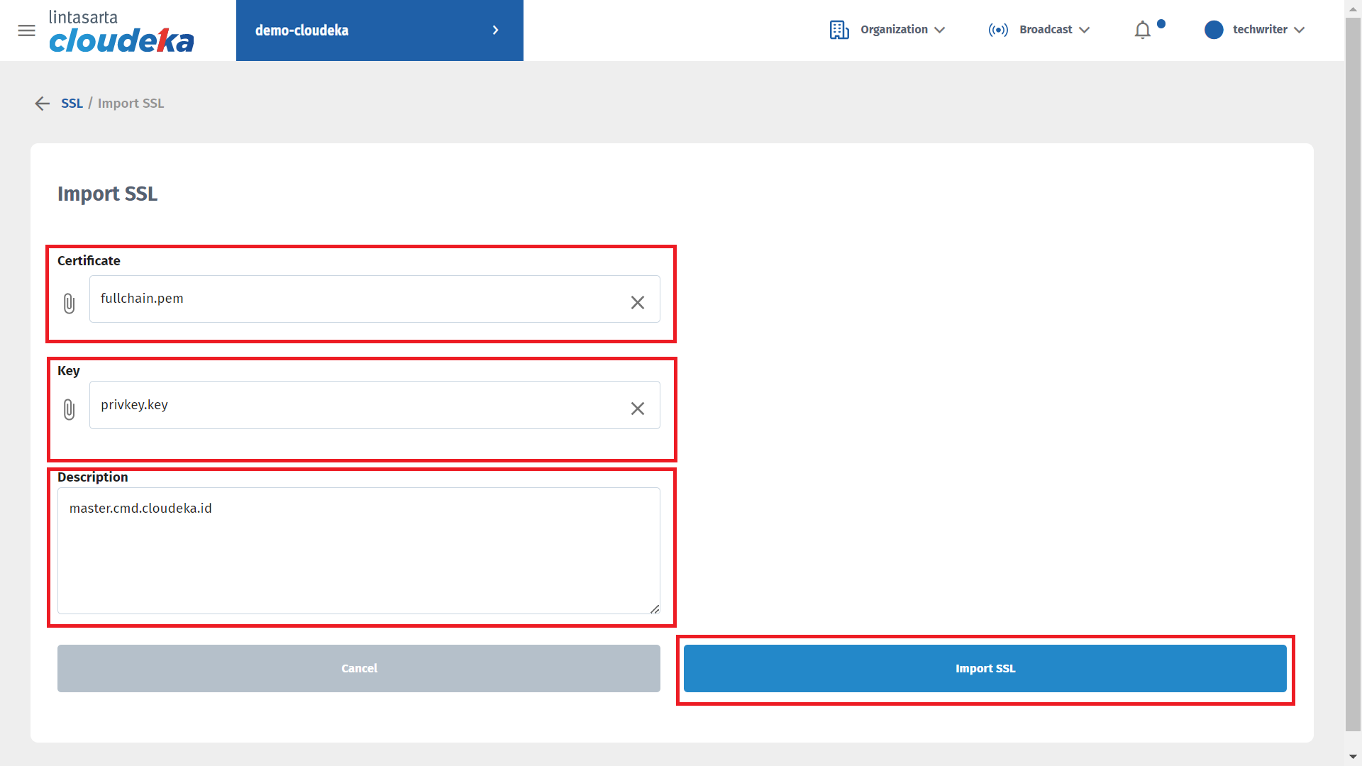 * In the Import SSL, there are some form to be filled.