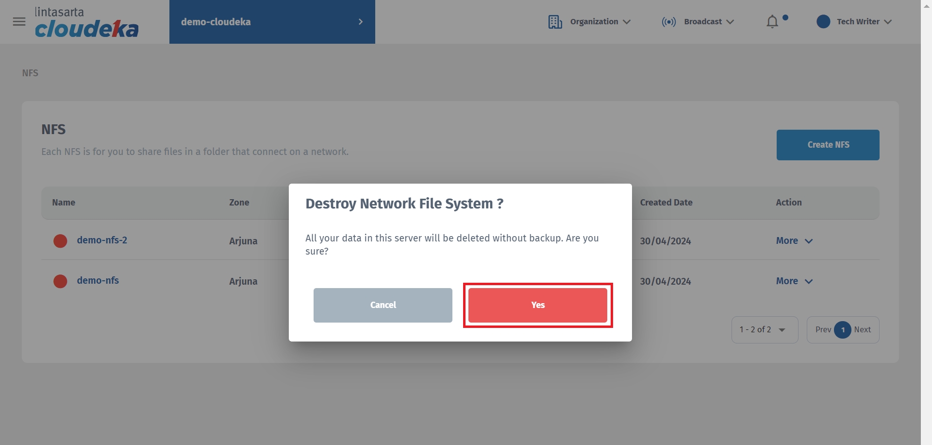 Wait until the deletion process is complete and the notification “Deka NFS “[project-deka-nfs] appears.