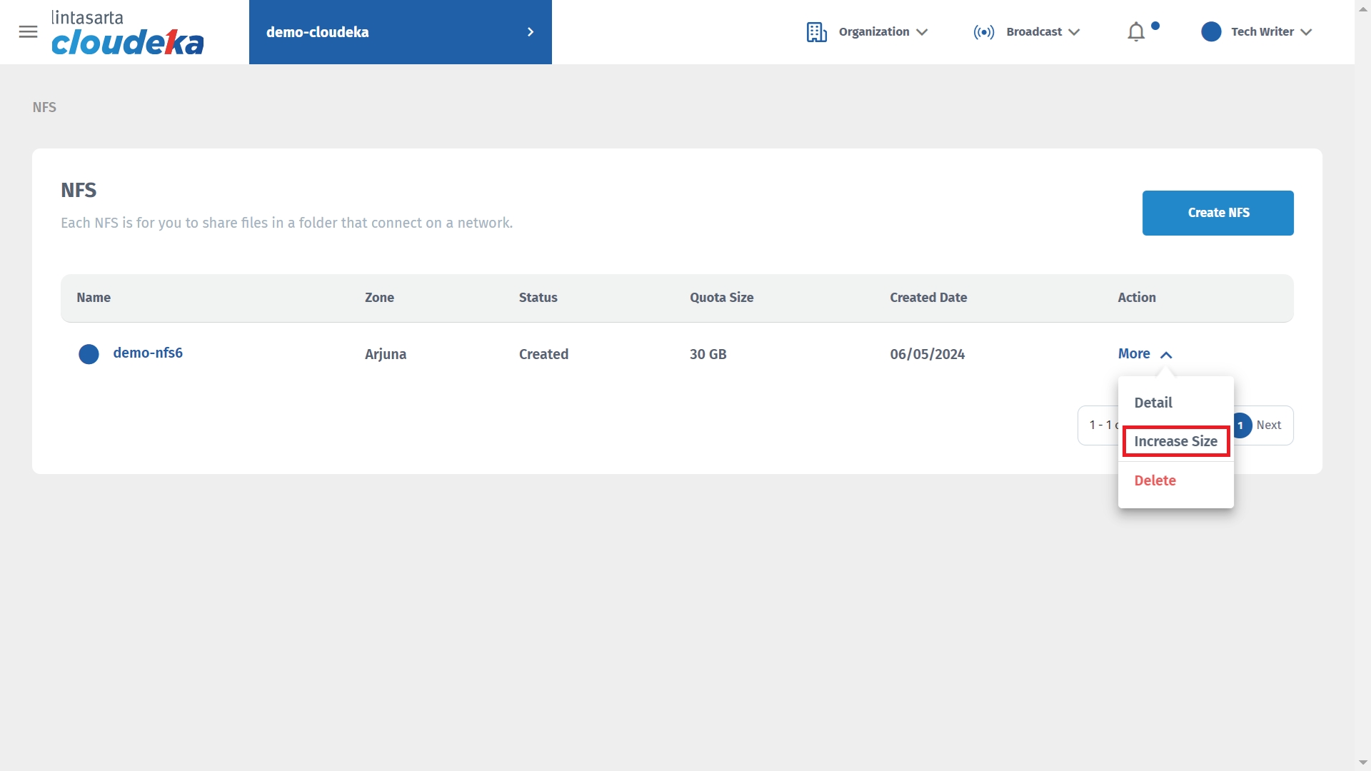 The Increase NFS Size window appears, enter the size and press the Save button. The minimum NFS size is 30GB.